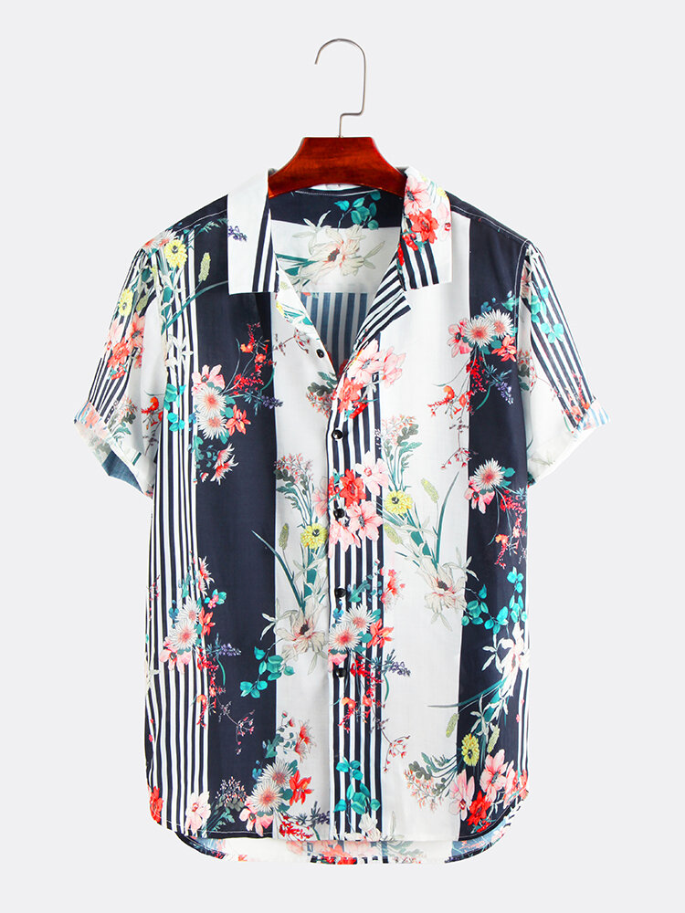 Flowers Stripe Mixed Print Short Sleeve Shirts – 3XL White