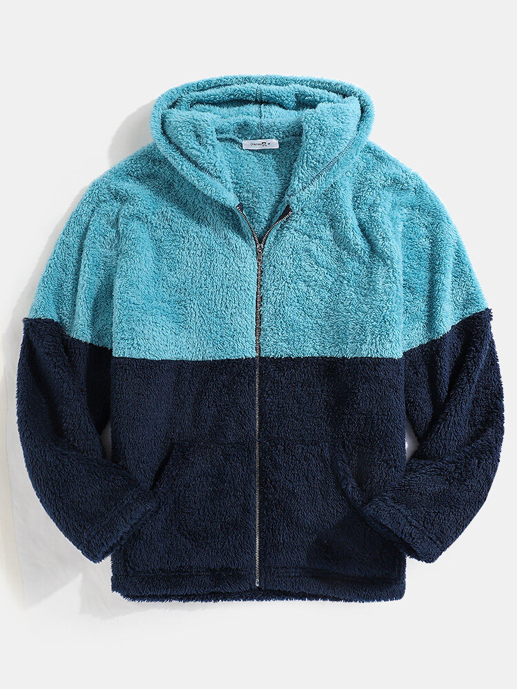 Fluffy Contrast Color Patchwork Pocket Csaual Teddy Hoodie Fluffy Jacket – Lake Blue S