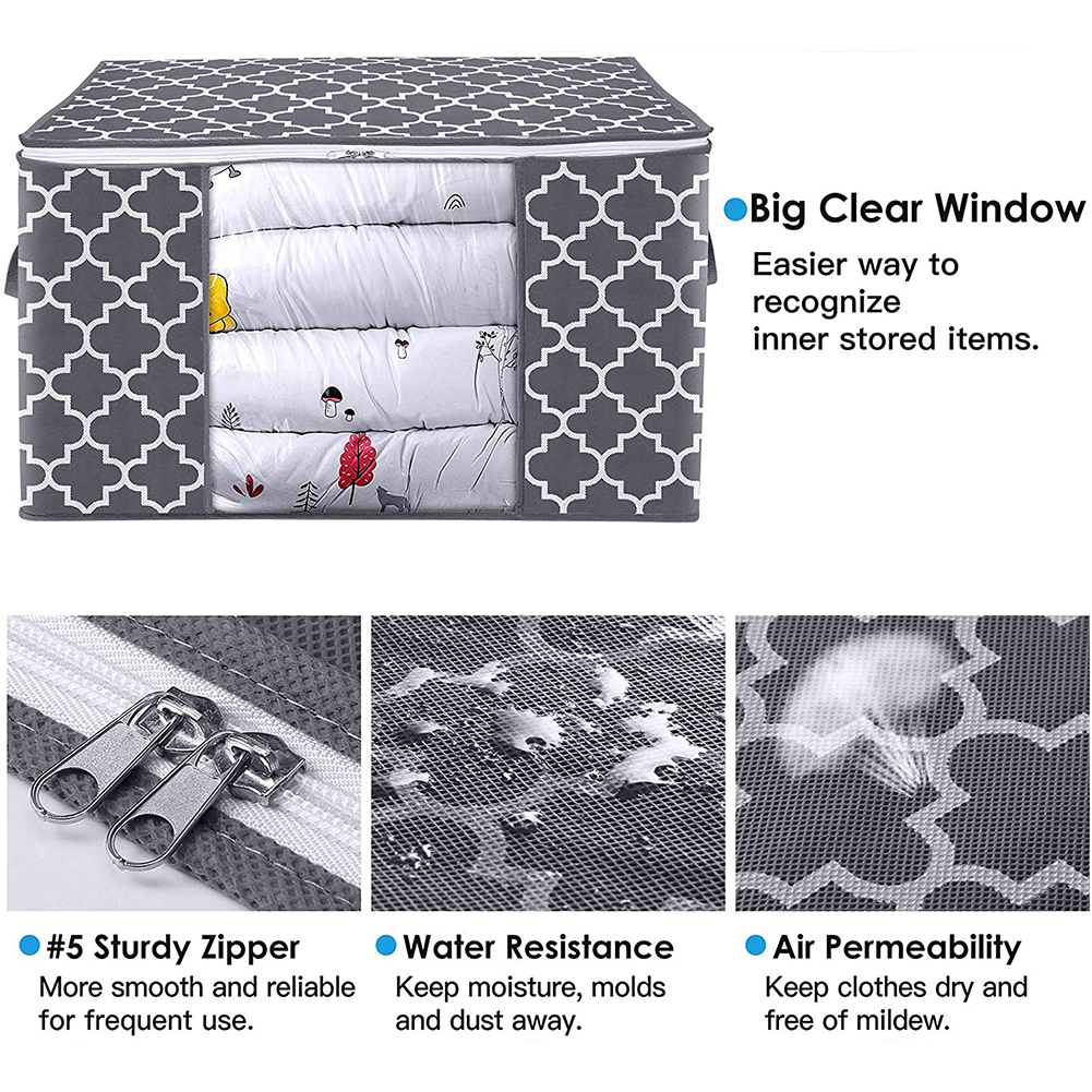 Premium fabrics: odorless non-woven fabric layers, breathable and waterproof. Each storage bag has a clear window: can help you view the contents and identify the content quickly and easily Stainless steel zipper: strong and smooth to ensure durability. The two-way zipper allows the bag to be easily opened and closed no matter how full it is. Reinforced handle: sewn with two layers of non-woven fabric and reinforced by strong stitching to increase strength and double the load-bearing capacity.