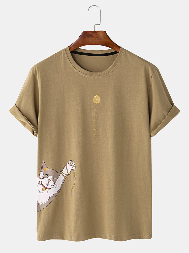 Funny Cat Cartoon Crew Neck Breathable Loose Fit Casaul T-Shirts – White M