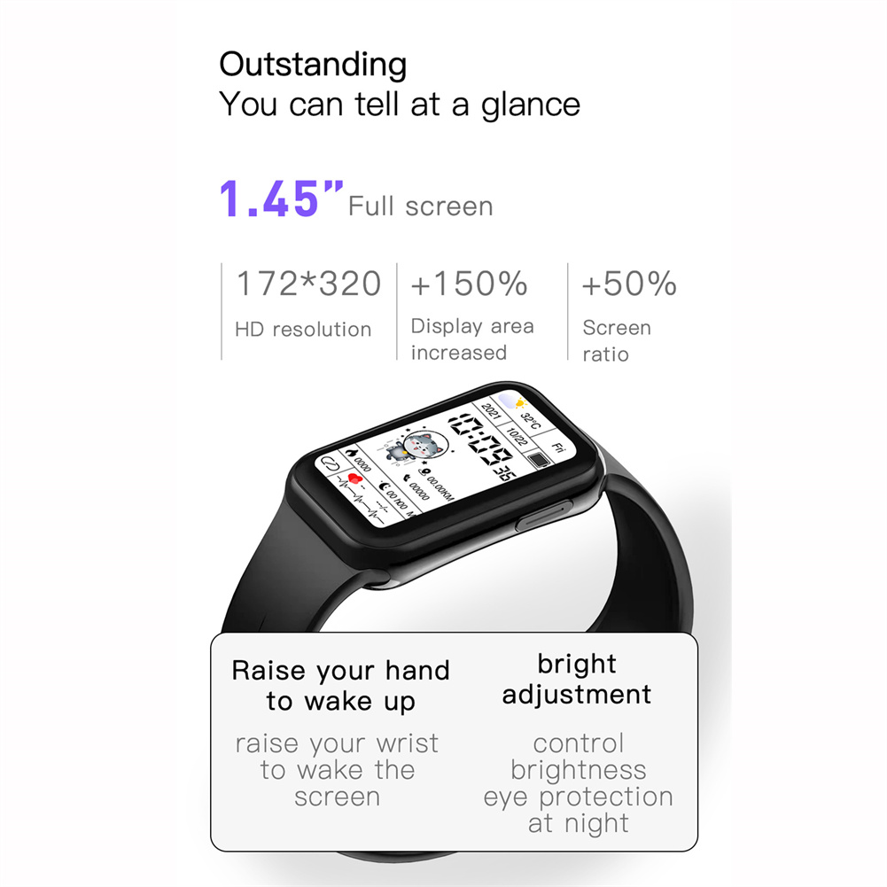 Screen size: 1.45 inch color screen TFT 172 x 320. Control method: full touch control, mobile APP control. Appearance material: zinc alloy middle frame, plastic bottom case, strap: silicone strap. Compatible system: compatible for Android 5.0 and above, compatible for iOS 9.0 and above. Product size: 44 x 28 x 9.8mm.