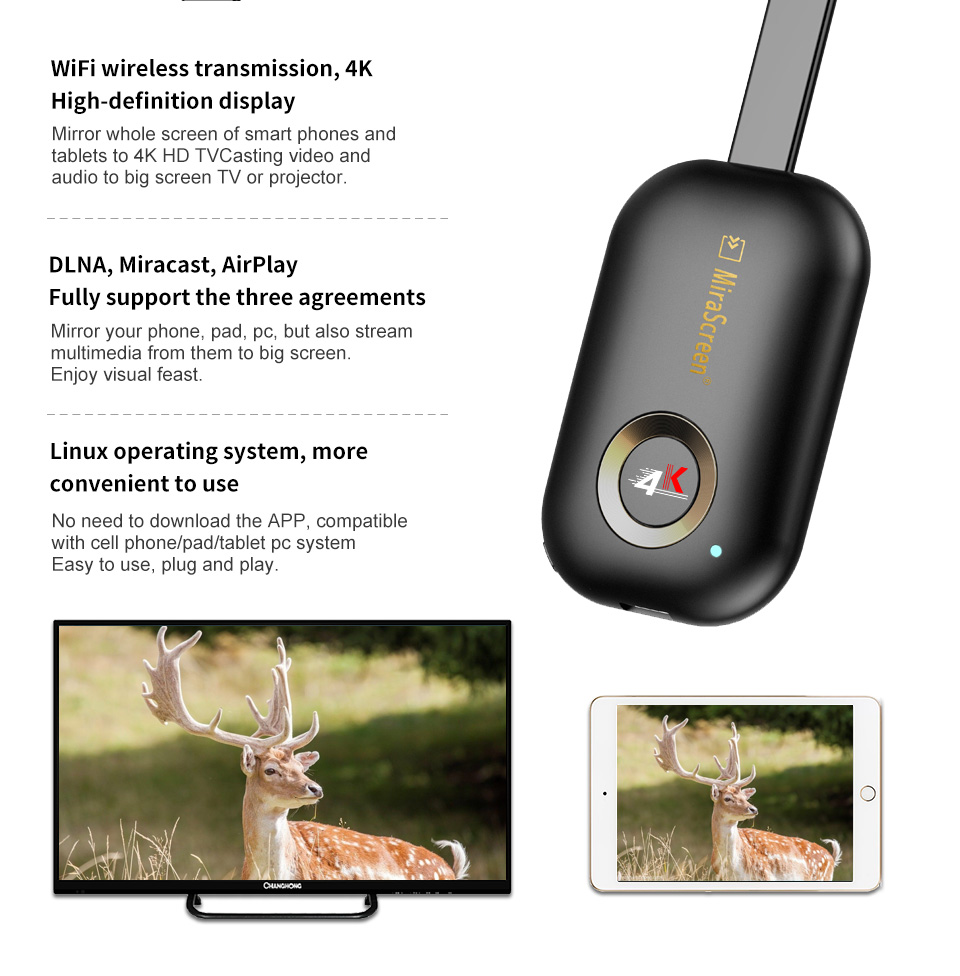 Wireless Display: wireless screen mirroring, sync mirror the entire screen of for iOS and for Android smartphone, tablet PC to HDTV or projector, perfect for PPT presentation and big screen movie.External WiFi module, supports 802.11b/g/n wireless connection, 2.4GHz/5G WiFi, strong signal, supporting video, audio, photo, office file wireless display.Supports Full HD wireless audio and video transmission, 4K output with HD interface. Uses compact portable deign for easy carrying.