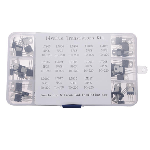 . 70pcs 14 valeurs L7805-LM317 Kit de transistor regulateur de tension avec boete de rangement Il y a 14 valeurs: Emballage inclus: 1 x 70pcs 14 valeurs L7805-LM317 Kit de transistor 100 x Capuchons isolants