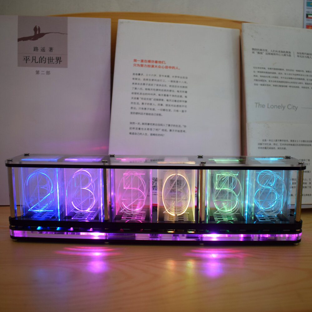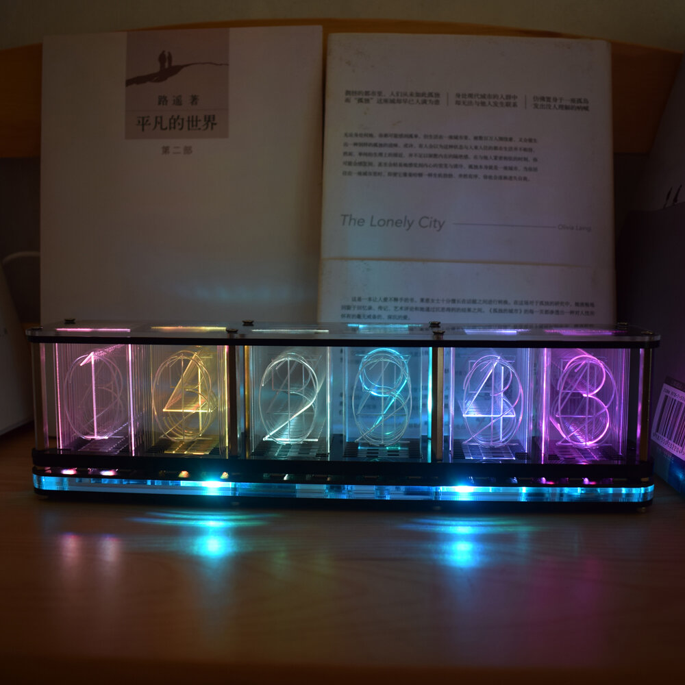 Differents numeros sont graves sur l'acrylique transparent, puis l'effet numerique est refracte par la lampe RVB brillante, qui simule l'effet d'affichage de l'horloge luminescente du tube fluorescent. Chaque numero produit differentes couleurs de degrade, formant des couleurs arc-en-ciel et divers effets de couleur aurore. Un effet de lumiere de couleur laterale est ajoute en bas. Il existe une variete d'effets d'animation d'affichage numerique temporel et de multiples animations de commutation.