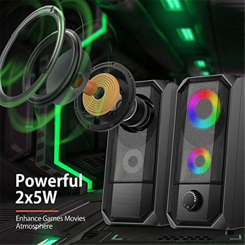 1. Dynamic RGB LightingLed light change different color, enhance atmosphere while playing game, listing music or watching movie.2. Balanced TimbreComputer speakers offer a sound that is full of presence and depth, delivers rich, balanced stereo and clear acoustics for a room-filling sound.3. Stylish Design The tough line design brings you a visual impact, makes your desktop no longer monotonous. ABS material, can be better moisture-proof, dust-proof and durable.4, Plug & Play for Broad Compatibility USB power supply with 3.5mm audio for PC, smart phone and Laptop, directly plugged into the computer USB port to take power, can also connect most of the 5V charger power supply.5. One-Knob Control Turn on/off switch, LED light and volume control using a simple knob on the front of the speakers.