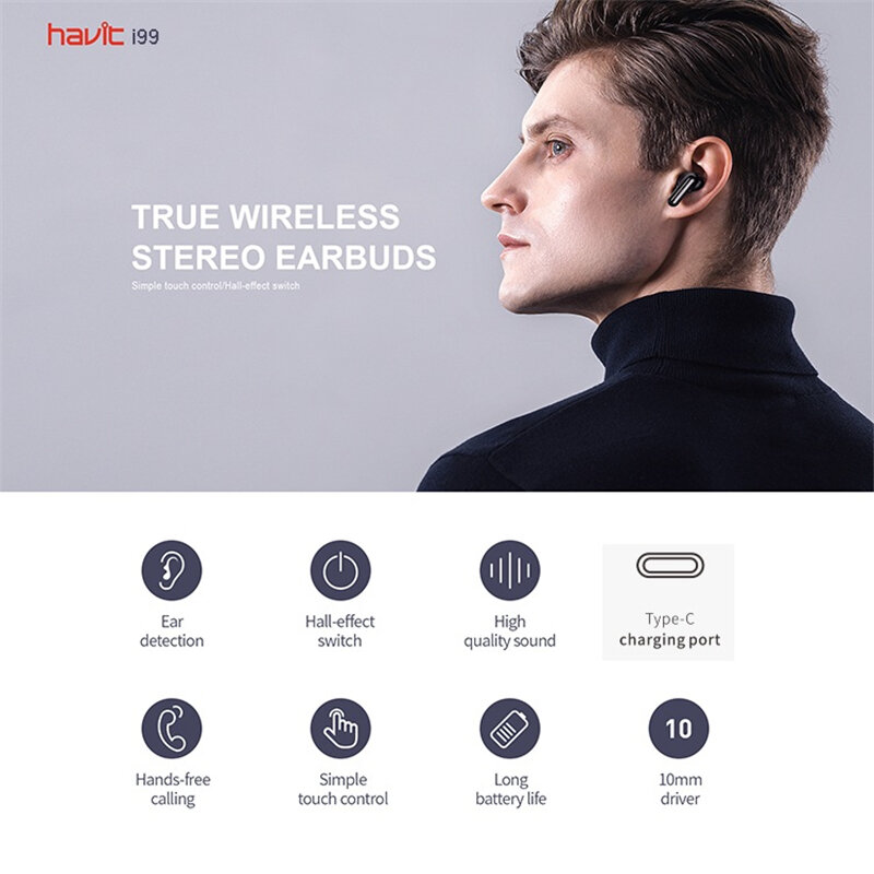 1* Havit I99 TWS Wireless Earbuds with Charging Box1* Type-C Charging Cable2 pairs of Eartips1* Manual
