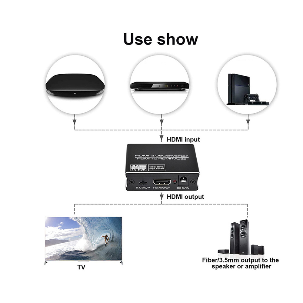 - One HDMI input to one HDMI output (pass-through mode), SPDIF (optical) digital audio output (2-channel/5.1-channel mode) and 3.5 mm stereo audio output (2-channel mode); 3.5 mm to RCA stereo audio cable. Does not support astronomical head mount SPDIF and L/R audio support separate output to amplifier, no need to connect TV/monitor; input resolution is up to 4K x 2K60Hz, 3D/24Hz. For some devices with low-power HDMI ports (such as PS4, PS4 Slim and other Sony devices), please use a mobile phone adapter to charge it (only USB cable is required)- Support 24 bit/deep color 30 bit, 36 bit per channel (36 bit for all channels) deep color; support video EDID transmission, audio EDID setting: Pass, 2CH and 5.1CH 3.5 mm audio output only supports 2-channel PCM stereo audio . SPDIF output supports 2-channel PCM, 5.1-channel Dolby Digital, DTS. The HDMI audio extractor will output Dolby True-HD, DTS-HD, AC3, DTS, DSD audio formats, but cannot decode these audio formats. If your amplifier or sound bar does not support these audio formats, there will be no audio on the sound bar or amplifier, so please set the audio format on the HDMI source to PCM/LPCM audio format.- Suitable for various HDMI source devices, such as Roku or Chromecast without dedicated audio output, and Blu-ray/DVD/HD players, cable/satellite TV boxes, Amazon Fire TV, Apple TV, PS3/4, XBOX, PC/laptops , HD camera, HD digital camera, etc.