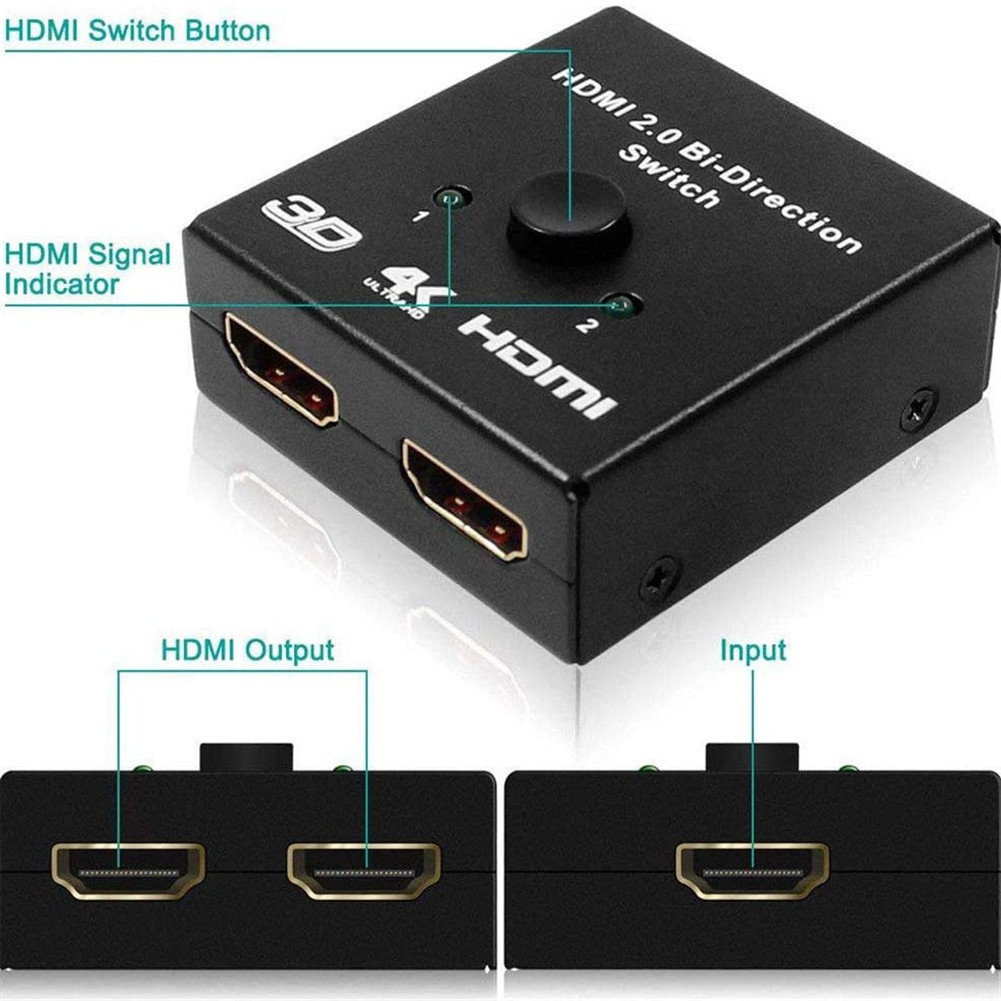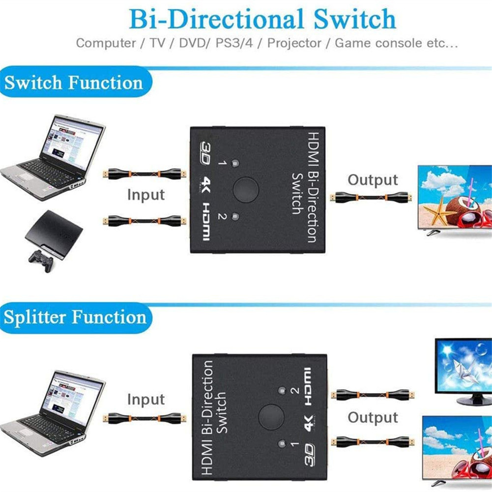 2 Input 1 Output or 1 Input 2 Output-HDMI Switch with Bi-Directional function and HDCP Passthrough allows you to connect two high-definition HDMI sources like Blu-ray or PS4 to a single HDMI display. It also allows you to output single high-definition source to two displays.4K Support-Up to 4K resolutions at 60fps, 32-bit Deep Color, 3D, and uncompressed/compressed audio formats are some of the newer HDMI features supported on this switch.