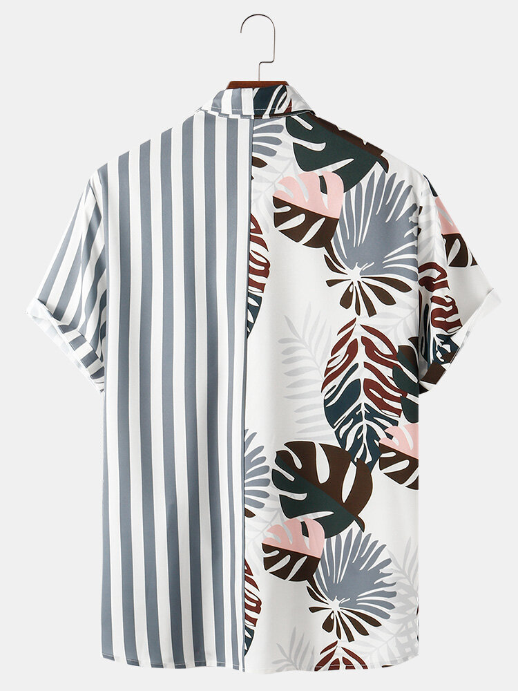 Holiday Style Stripe Patchwork Leaves Print Mens Short Sleeve Shirts – Grey L