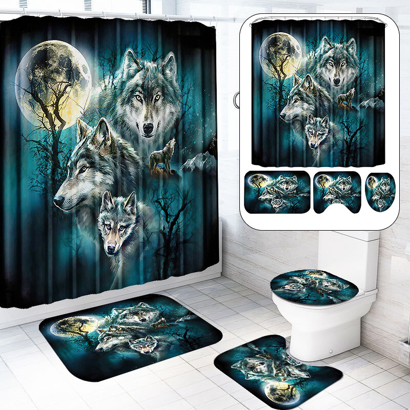 HUANGLING Shower Curtain Wolf 12 Hooks Set Polyester Waterproof Bathroom Decor Resistant – B