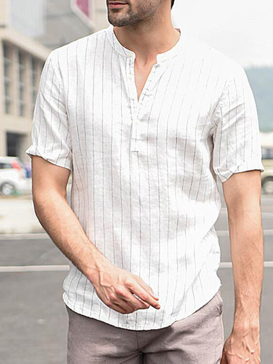 Material:CottonFit Type:Regular FitNeckline:Henley CollarPattern Type:StripedScene:Leisure,Home,Beach,CasualSeason:Spring,SummerSize:XXXL,XXL,L,S,MSleeve:Short SleeveStyle:Casual