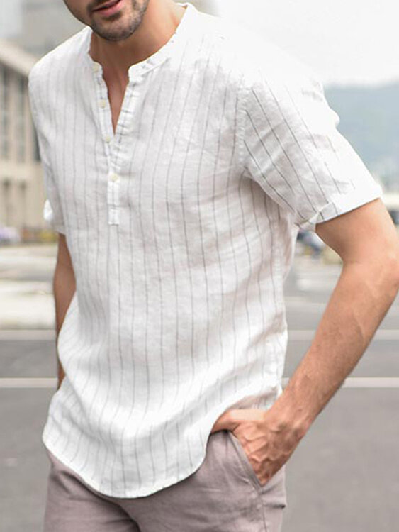 Description:Material:CottonFit Type:Regular FitNeckline:Henley CollarPattern Type:StripedScene:Leisure,Home,Beach,CasualSeason:Spring,SummerSize:XXXL,XXL,L,S,MSleeve:Short SleeveStyle:Casual