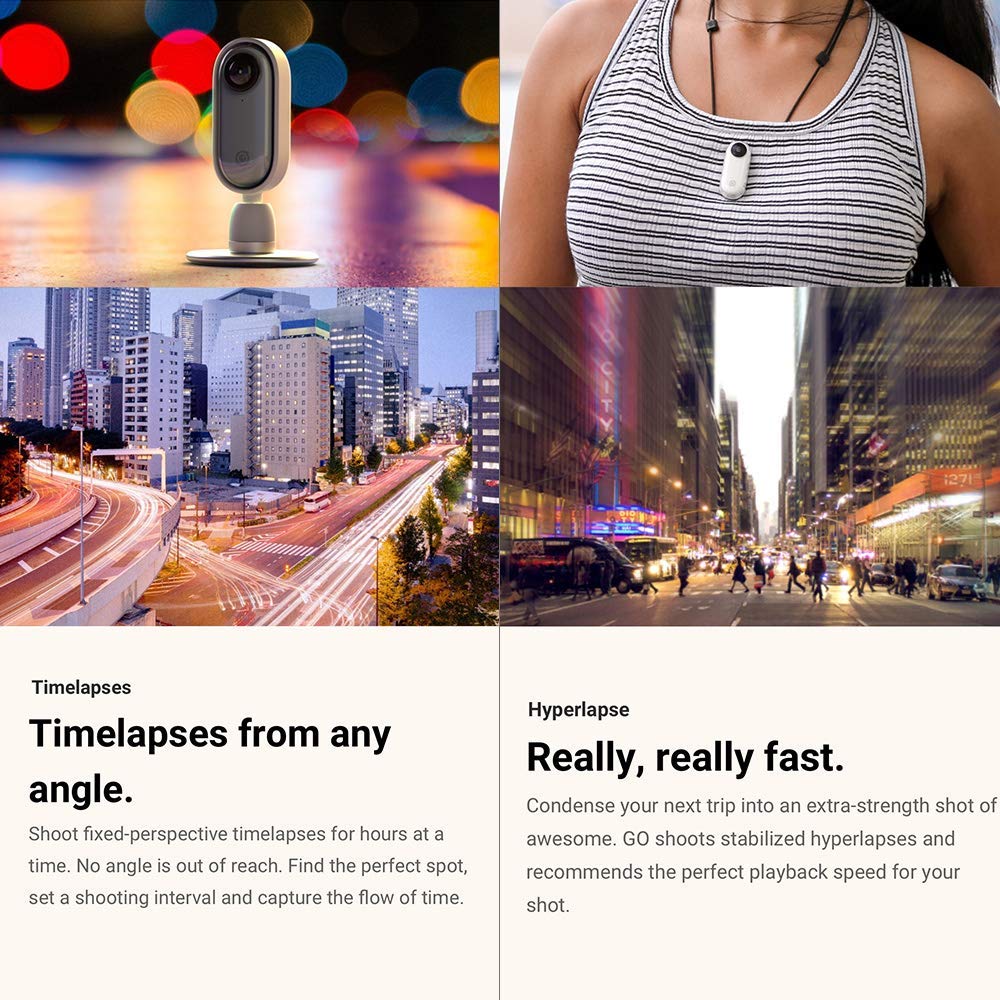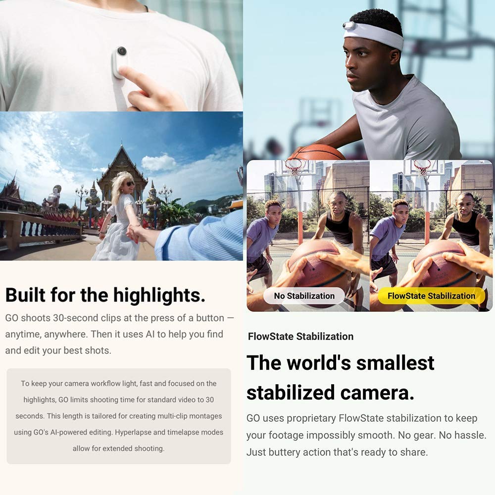 Go is a thumb-sized action camera that shoots short and sharable videos(max. 1080P), and then edits them automatically for you.GO has 4 basic functions(QuickCapture/Single Tap/ Double Tap/ Triple Tap), which can be customized to your preference in the app.Smooth and Amazing Shooting Effects: FlowState stabilization lets you capture hypnotically smooth video.One-tap timelapse and hyperlapse easily make you shooting mind-blowing; and supports 720p 120fps slow motion.