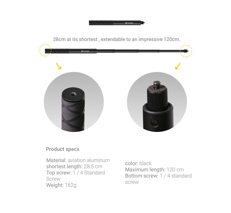 Insta360 selfie stick, lightweight aluminum material, easy to use.Universal 1/4 screw port makes it easier to fit into most sports cameras and smartphones.Threaded handle design, in addition to anti-slip function, also has a better hand feel.Minimum length of 28cm, easy to carry and collect.Max extened length of 120cm, Handle knob controls locking and releasing, Stable structure, not easy to loose.It is perfect for Insta360 One 360 VR Camera and supports One's selfie stick hidden mode.