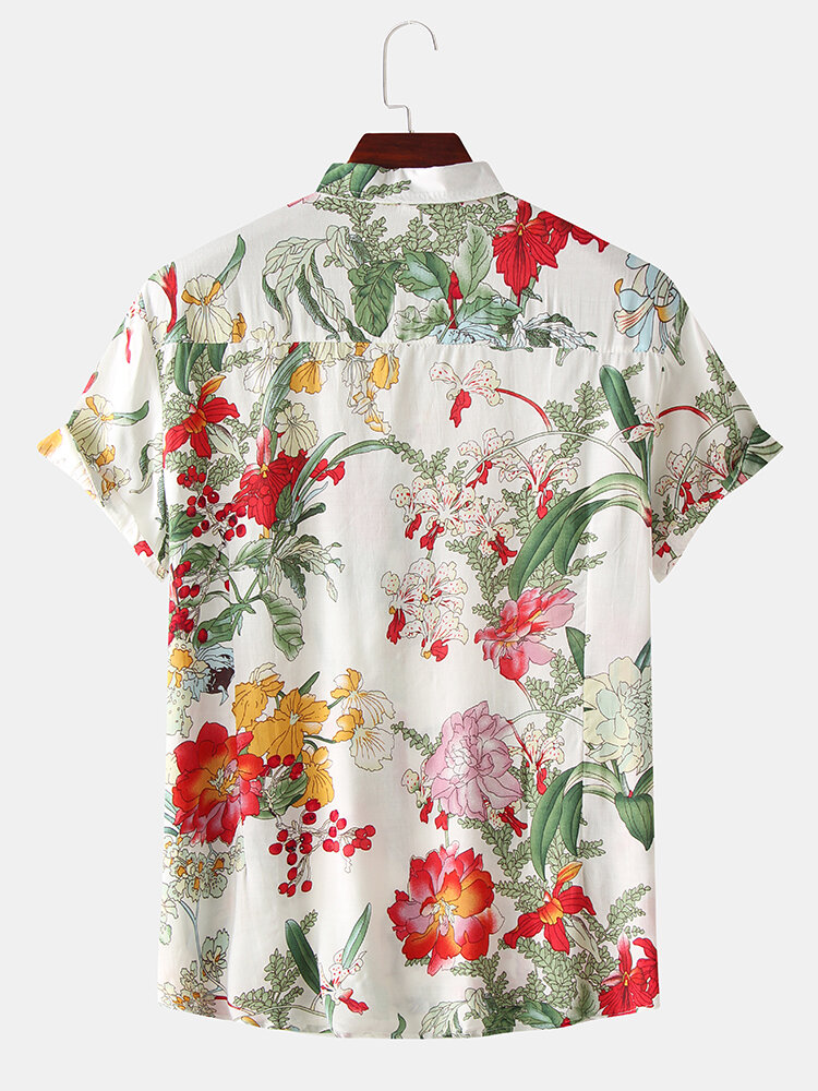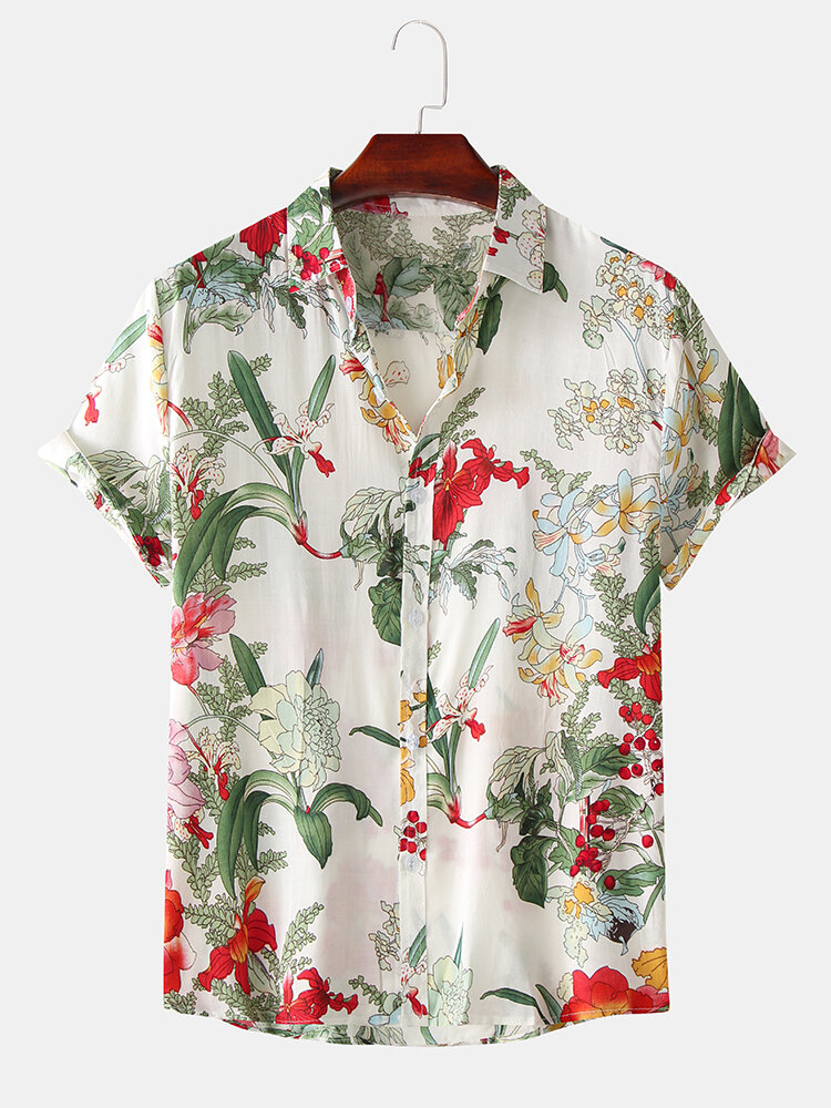 Closure Type:Single BreastedCollar:Turn-down CollarColor:WhiteCrafts:PrintingCuff Type:Straight SleevesDecoration:ButtonFit Type:FitLength:RegularMaterial:CottonOccasion:Beach,Casual,Leisure,OutdoorPattern:FloralSeason:SummerSize:L,M,S,XLSleeve Length:Short SleeveThickness:Regular