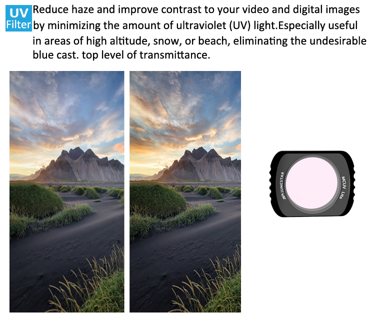 Reduce haze and improve contrast to your video and digital images by minimizing the amount of ultraviolet (UV) light.Especially useful in areas of high altitude,snow, or beach, eliminating the undesirable blue cast. top level of transmittance.Removes unwanted reflections from non-metallic surfaces such as water or glass and glare from the sun.InCBeases color saturation, CBeating deep, rich scenic images.Helps to reduce the amount of light entering the lens.