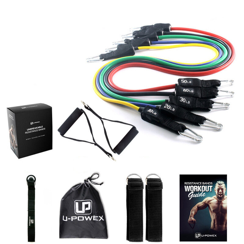 Features:DIVERSE TRAINING OPTIONS:With this complete workout kit, you' ll never miss any chance to challenge various training difficulties for strength building and muscle toning.ADJUSTABLE RESISTANCE LEVELS:Each band is different in colors and resistance levels: Yellow - 10lbs,Blue- 20lbs, Green - 30lbs, Black- 40lbs, Red - 50lbs, with total resistance weight of 150lbs. SUPERB WORKOUT EXPERIENCE:Made of highest quality natural latex and thread count nylon, the bands are snap-resistant and capable of maintaining the maximum resistance levels even after repeated stretch and use.