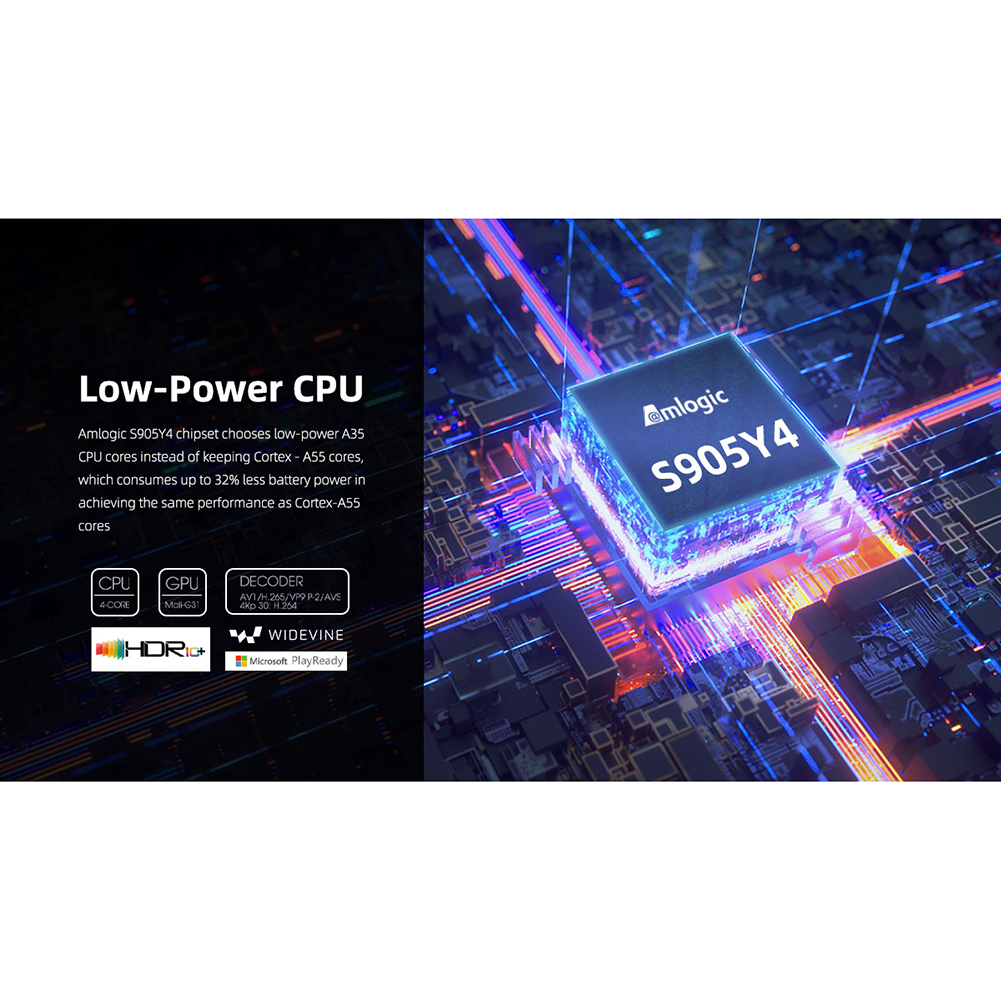 --Amlogic S905Y4 quad-core A35up to1.8GHz.--Google TV System. Netflix and Prime Video pre-certification.--Ultra HD, HDR10, Dolby Audio. Support AV1 decoding.--2GB LPDDR4 + 8GB EMMC.--WiFi5 Dual Band and BT5.0.--TV stick size: 92.5x29.5x14.5mm.