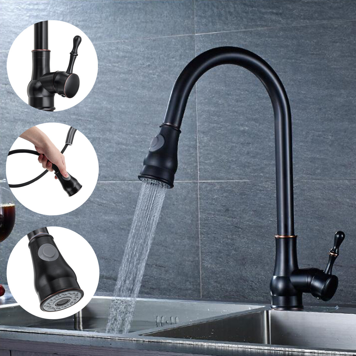 Features:-Can rotate 360 °, multi-angle water outlet, wider water outlet area, easy to use.-Two water outlet modes are changed to meet different cleaning needs.-The faucet can be pulled out of the length of 60-70 for washing outside the cleaning basin.-Environmentally friendly brass made to protect healthy water.-Pull-out design for daily use.-Corrosion and rust resistance, strong and durable.-The surface is treated by hand-drawing and PVD plating process, with long service life.