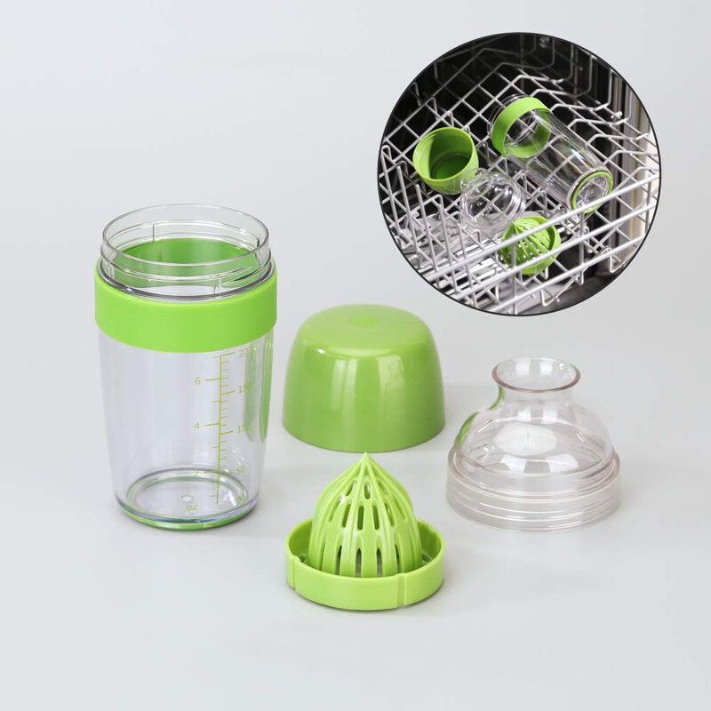 -2 in 1: This salad dressing bottle contains a citrus juicer inside. Ideal for making, mixing, serving and storing dressings, sauces and marinades; Cocktail shaker shape for efficient mixing.-Wide dripless pourer accommodates a range of ingredients; Airtight, watertight, leakproof seal.-Dishwasher safe & Detachable for easy cleaning; The oz/ml measurements on the dressing bottle will eliminate the need for cups and spoons, making everything so much easier for you!-Silionce ring on the body provides better grip; Anti-slip ring on the bottom enhances the stability when making the juice.