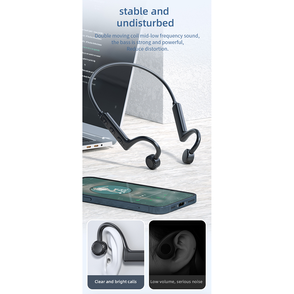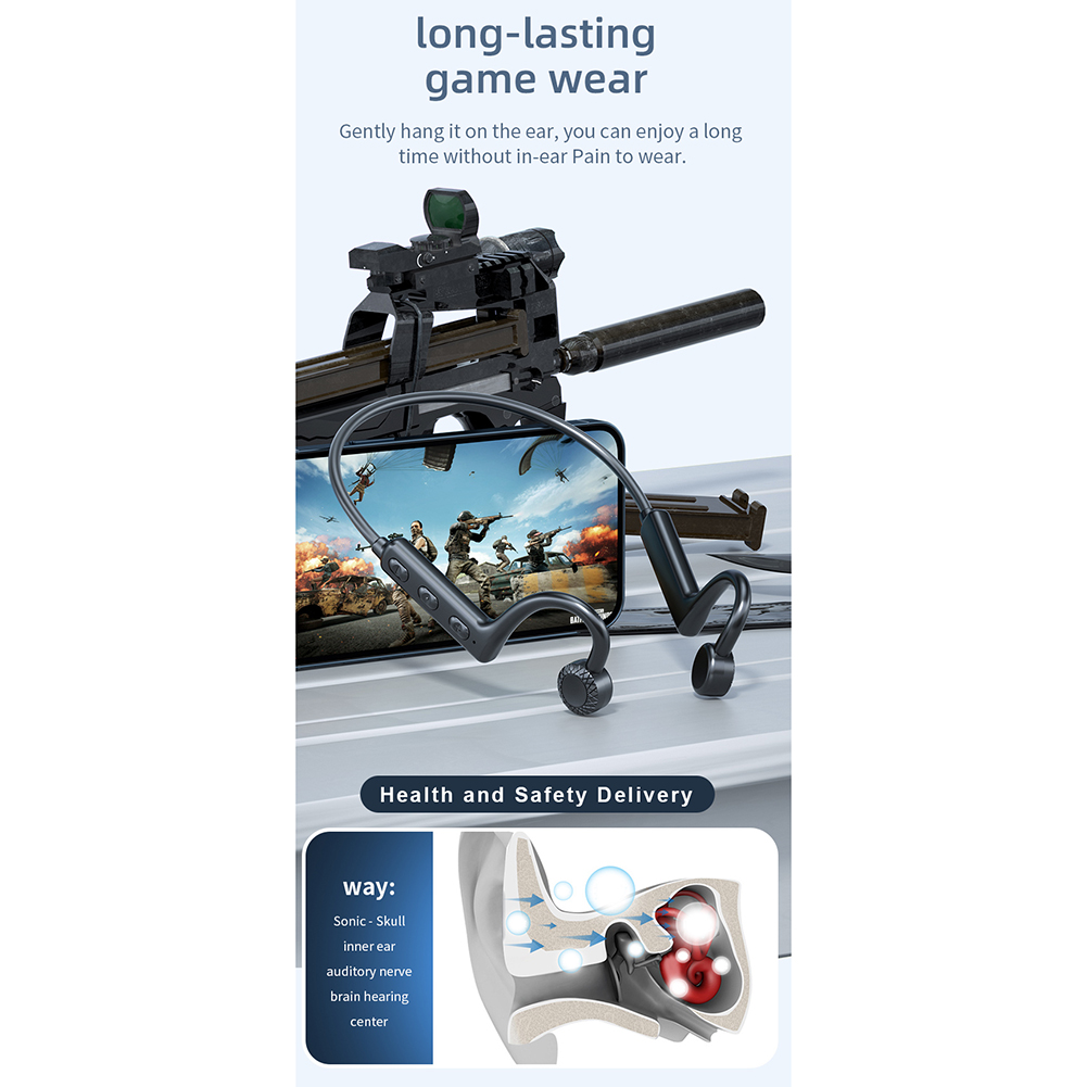 Bone conduction sound transmission, no contact with the ear, no sense of wearing. Lightweight design, long-lasting without feeling of falling. It is comfortable to wear, stable and does not shift, and there is no strange feeling when wearing it for a long time. 110mAh battery, long standby time of 18 hours, suitable for various scenarios. Low-latency Bluetooth-compatible chip, play games smoothly, synchronize audio and video, and eat chicken steadily.