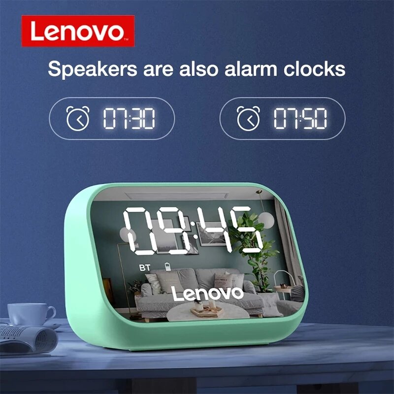 Features:-Adopt upgraded BT5.0 chip, 10m wireless transmission distance, low latency, stable and fast connection, wide compatibility.-Full frequency speaker unit effectively extends stereo field, rich sound levels, stereo surround sound effect.-Single alarm clock design, easy setting, no need to worry about missing time.-Mirror display design, you can see time and other functions at a glance, convenient to use.-Built-in microphone, intelligent noise reduction, clear and bright sound without delay.-Built-in 1500mAh large capacity lithium battery, safe and stable, long endurance time.Specification:Brand: LenovoModel: TS13Color: Black/White/Green/Pink(optional)BT version: V5.0BT transmission distance: About 10mShell material: ABSFrequency response: 20Hz-20KHzPlaying time: About 6 hoursBattery capacity: 1500mAhSupported protocol: A2DP/HFP/HSP/AVRCPRated input: 5V/500mAItem size: 15 * 7.2 * 6cm /5.91 * 2.83 * 2.36in