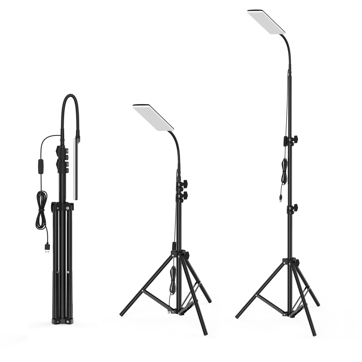 Features:1.Free to lift and reduce, foldable 0.6m, openable 1.8m.2. Convenient power supply, can use USB 5V power supply, also can use charger or car charger to device.3. Suitable for on-site photography, lighting, self-driving, camping lights outdoor activities.4.The difference with the old version: the angle of the new version can be adjusted.