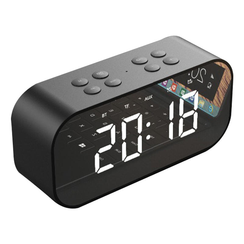 Features: With control buttons, perfect stereo audio and mega bass, this speaker will bring you the best listening enjoyment.Set it on the desktop for a convenient and elegant set up, its fashion and stylish appearance will uplift your lifestyle, perfect for bedroom, desktop, home, office. Wireless connect and play via bluetooth 5.0,Two channels of 3.5mm external AUX audio input,Large LED time display with dual alarm clocks setting,Comes with smooth cover like mirror, enjoy it for making up at any time bluetooth Surround Speaker: With wireless bluetooth 5.0 speaker, listening to your music with a tap of a finger, fit in cellphone, tablet, laptop and so on Digital Alarm Clock: Make you wake up in the morning and sleep at night, dual alarm clocks can be set and used independently, bid farewell to the traditional alarm clock Flexibly Placing: Fashion and portable design suits any home decoration. Various audio source modes for savoring your stereo music good time everywhereSimplicity and Portability: With TF card interface, built-in 2000mAh lithium-ion battery,provide up to 10 hours working time, perfect for home, party, picnic, travel, etc.Specification: