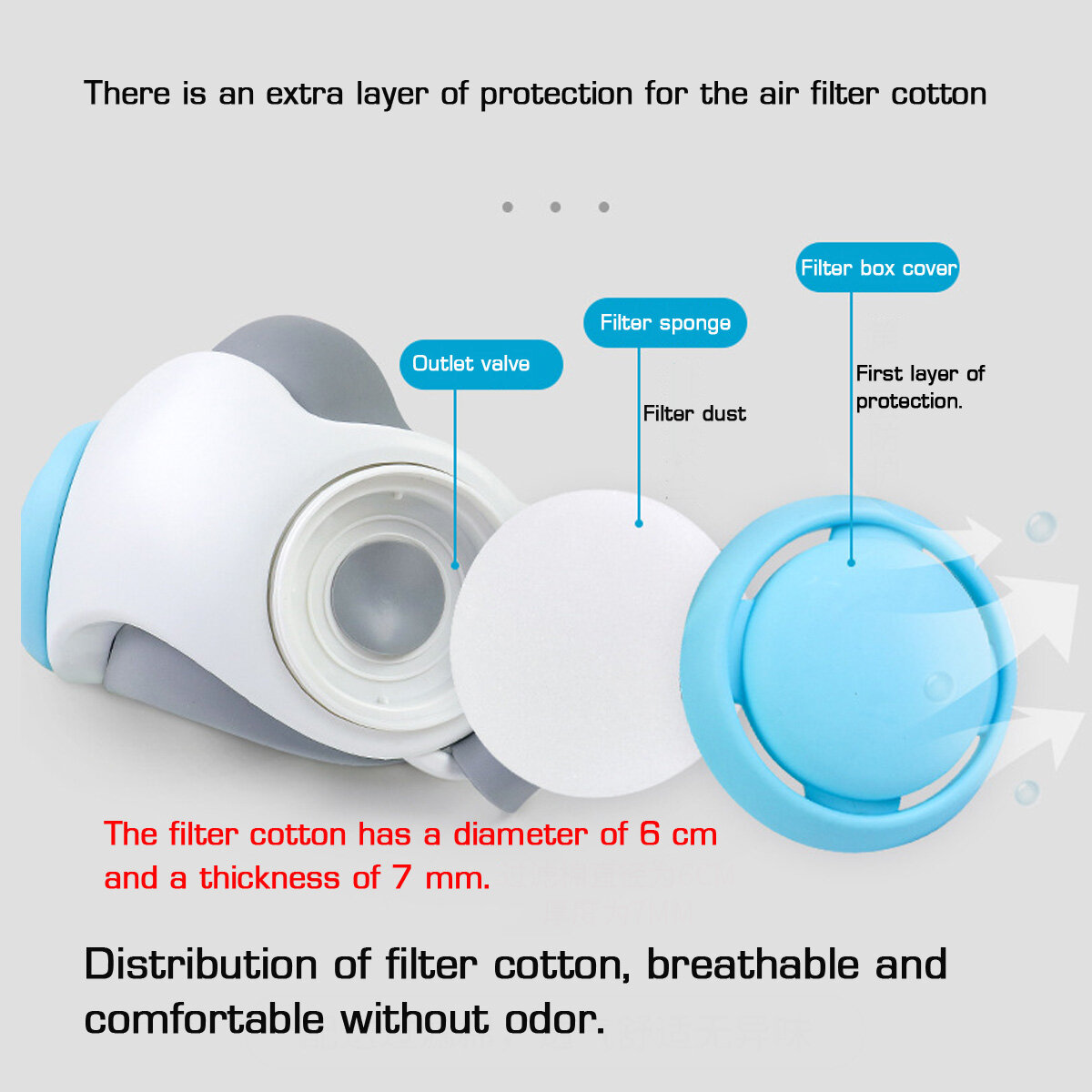 - Principe de fonctionnement du masque anti-poussiere, filtrage multicouche de la soupape d'admission.