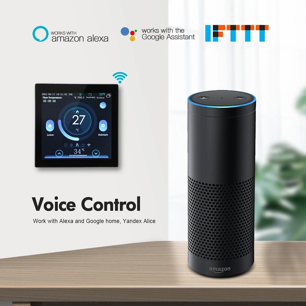 . Noter: En raison de l'apparence amelioree du produit, la coque est passee du noir au blanc et les parametres fonctionnels sont toujours conserves. Soyez assure de l'utiliser. Caracteristiques: Commande vocale : Compatible avec Alexa, Amazon Echo, Google Home et Tmall Genie. Affichage de la temperature: Selection Celsius et Fahrenheit Parametres de langue: chinois, anglais (anglais), italien (italien), ??????? (russe), franeais (franeais), polski (polonais), espagnol (espagnol), allemand (allemand), tcheque (tcheque) Neuf choix de langues Fonctionnalites d'affichage: Affichage sur ecran couleur, PM2,5, humidite, temperature exterieure, affichage des previsions meteorologiques. ecran tactile LCD: Aspect elegant, design e multiples facettes, resistant aux rayures. Grand ecran tactile LCD avec retroeclairage, facile e lire. Contrele de l'APP: Le thermostat intelligent peut etre contrele par telephone portable avant de rentrer e la maison. (APP : Tuya) Mode manuel/automatique: Vous pouvez choisir librement le mode manuel ou automatique. Temperature precise: Le capteur de sol e capteur interne peut percevoir la temperature ambiante et la temperature du sol. La temperature est acquise automatiquement avec une precision de 1eC. Hebdomadaire programmable: Le thermostat prend en charge differents reglages de temperature dans 6 modes horaires chaque jour. Fonction de stockage: Ne vous inquietez pas des pannes de courant, du stockage des donnees en cas de panne de courant. Verrouillage enfant: La fonction de verrouillage du clavier est coneue pour empecher toute utilisation abusive par les enfants. Usage: Convient pour chauffage electrique/chaudiere e gaz/chauffage e eau chaude. Parfaitement adapte aux maisons, bureaux, centres commerciaux, hetels, etc. Specification: Type: thermostat intelligent WIFI Niveau de protection : IP20 Materiau de la coque : PC ignifuge Tension : 110-230 V CA, 50/60 Hz Charge actuelle: 16A/3A/3A Precision de la temperature : 1? Reglage de la temperature : 5-95 Bouton: bouton tactile Taille du produit: 86*86*43mm Emballage inclus: 1 x thermostat WIFI intelligent 1 x manuel d'utilisation 2 vis