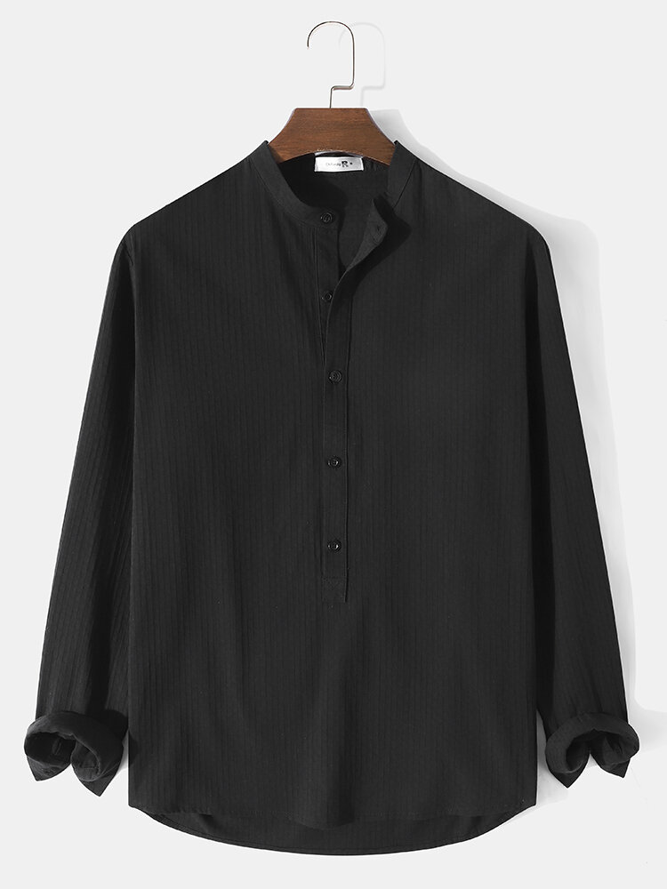 Men 100% Cotton Basic Plain Ribbed Henley Collar Long Sleeve Shirts – Black S