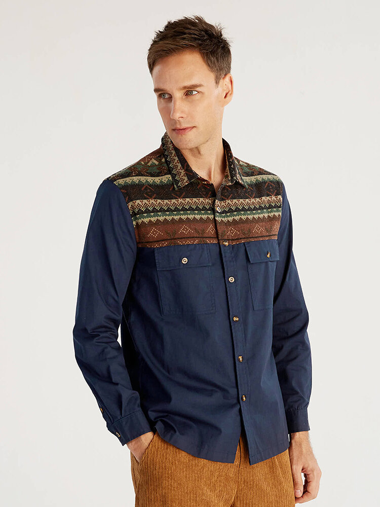Men 100% Cotton Ethnic Pattern Patchwork Dual Pockets Vintage Shirts – Navy 3XL