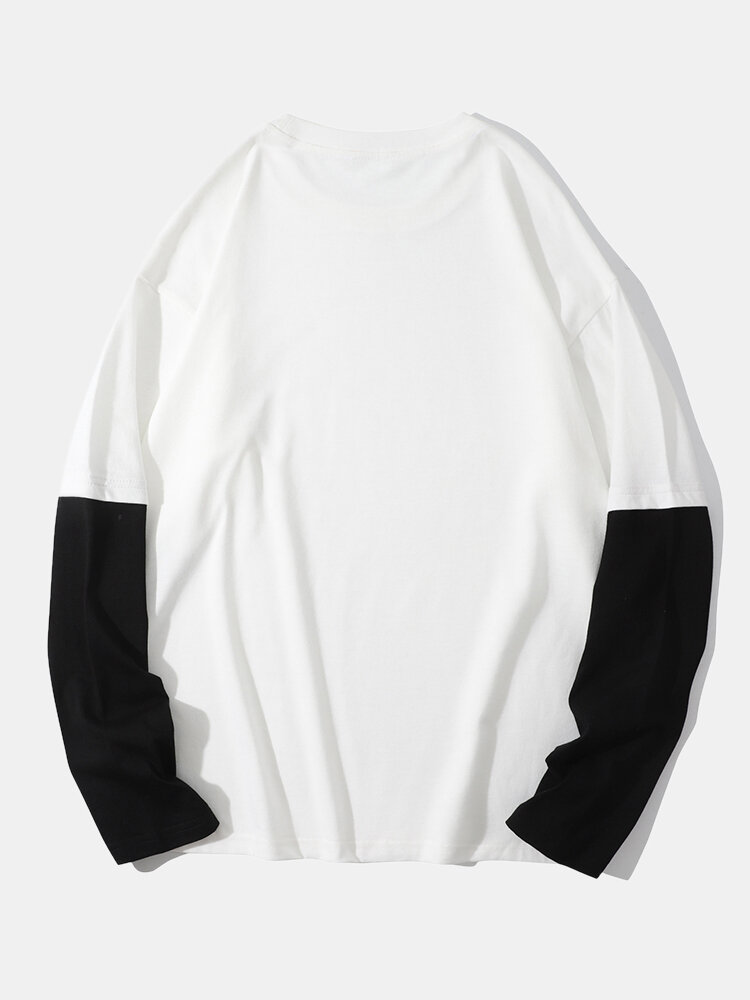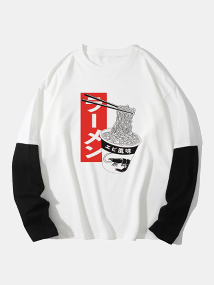 Men 100% Cotton Japanese Noodles Print 2 In 1 Long Sleeve T-Shirts – White 2XL