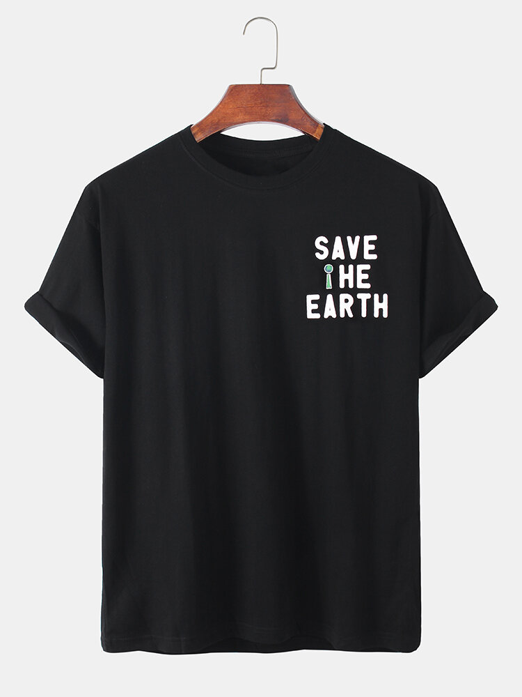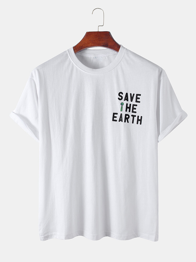Men 100% Cotton Save The Earth Slogan Print Casual Short Sleeve T-Shirts – White M