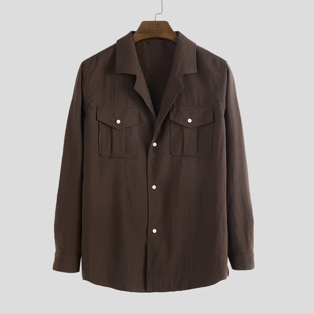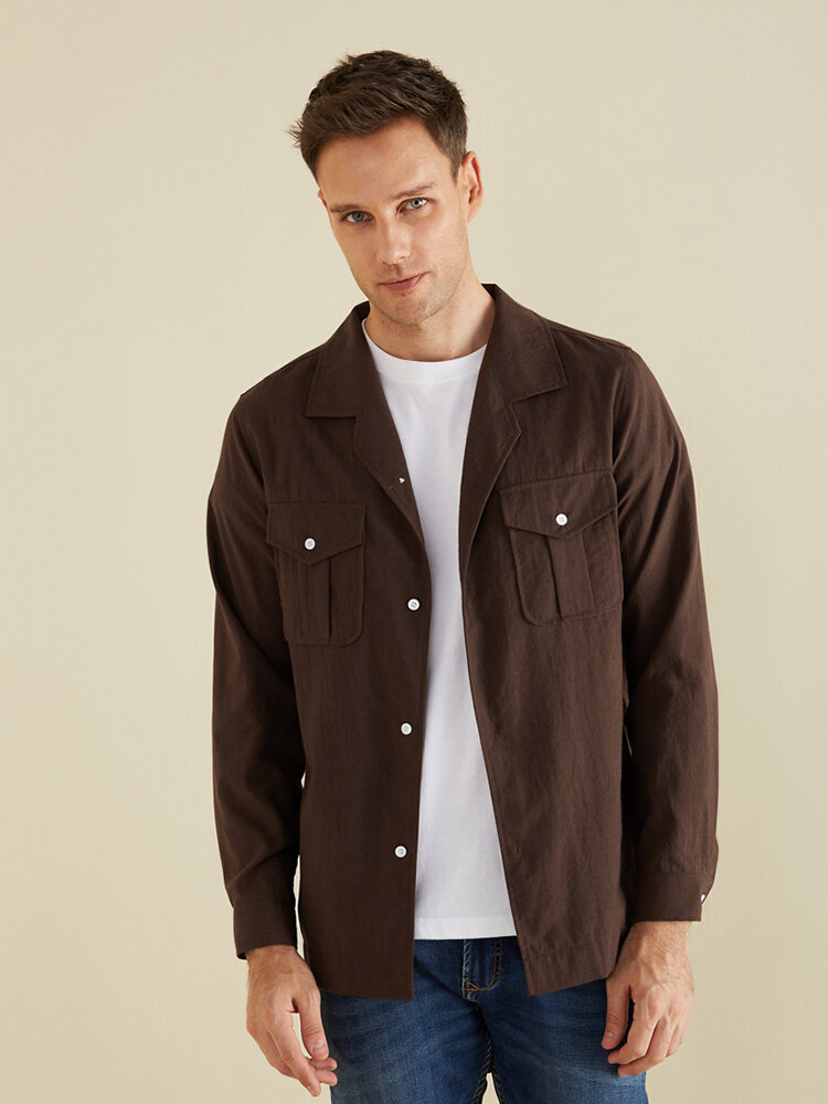 Men 100% Cotton Solid Color Turn Down Collar Long Sleeve Shirts – M Green