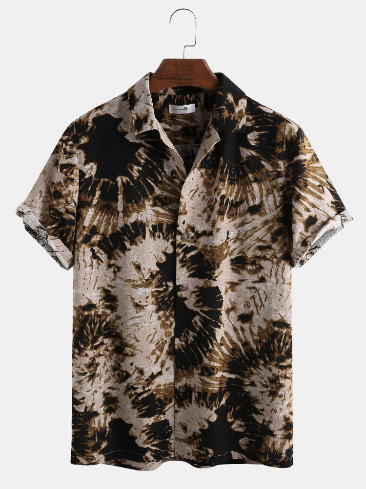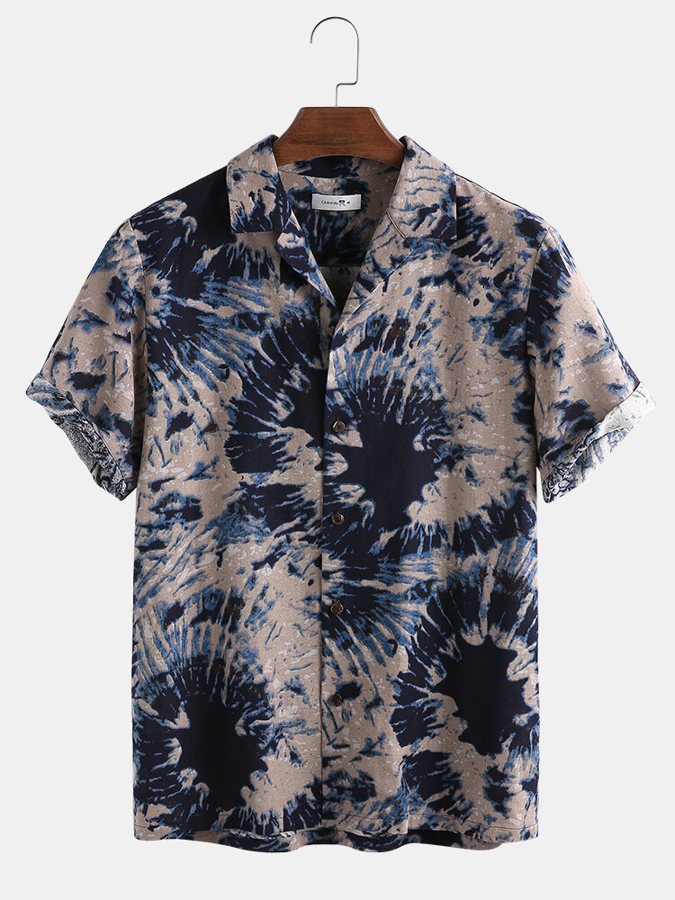 Men 100% Cotton Tie-Dye Print Casual Loose Lapel Short Sleeve Shirts – Blue M
