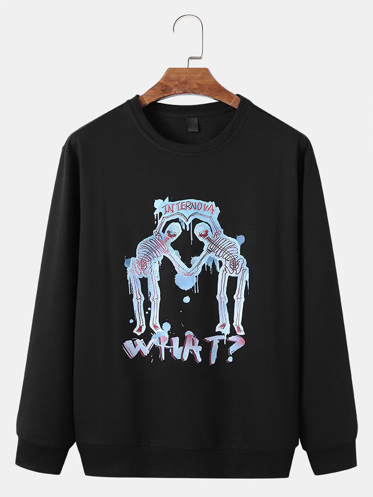 Men 100%Cotton Pattern Skull Funny Letter Crew Neck Casual Pullover Sweatshirt – Black S
