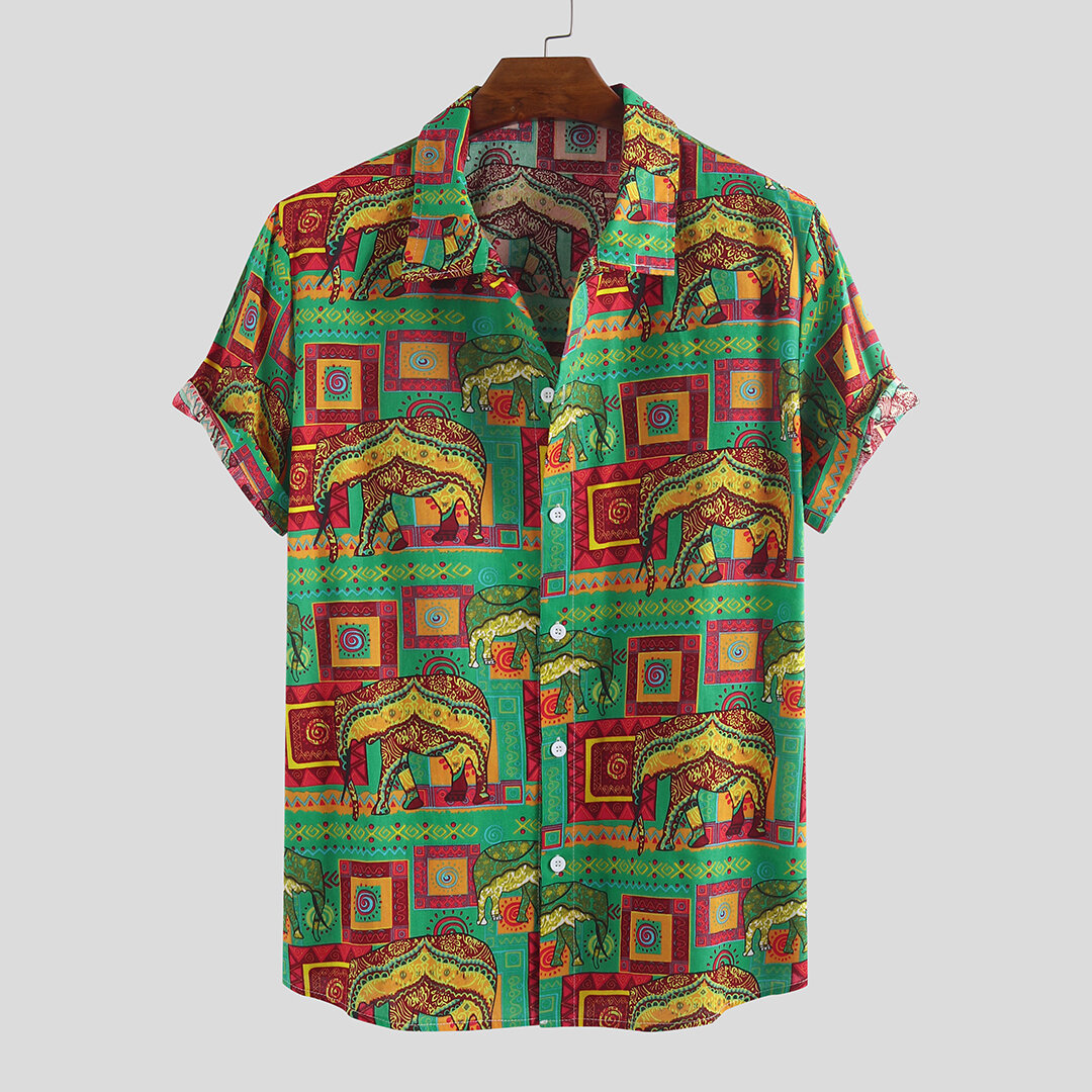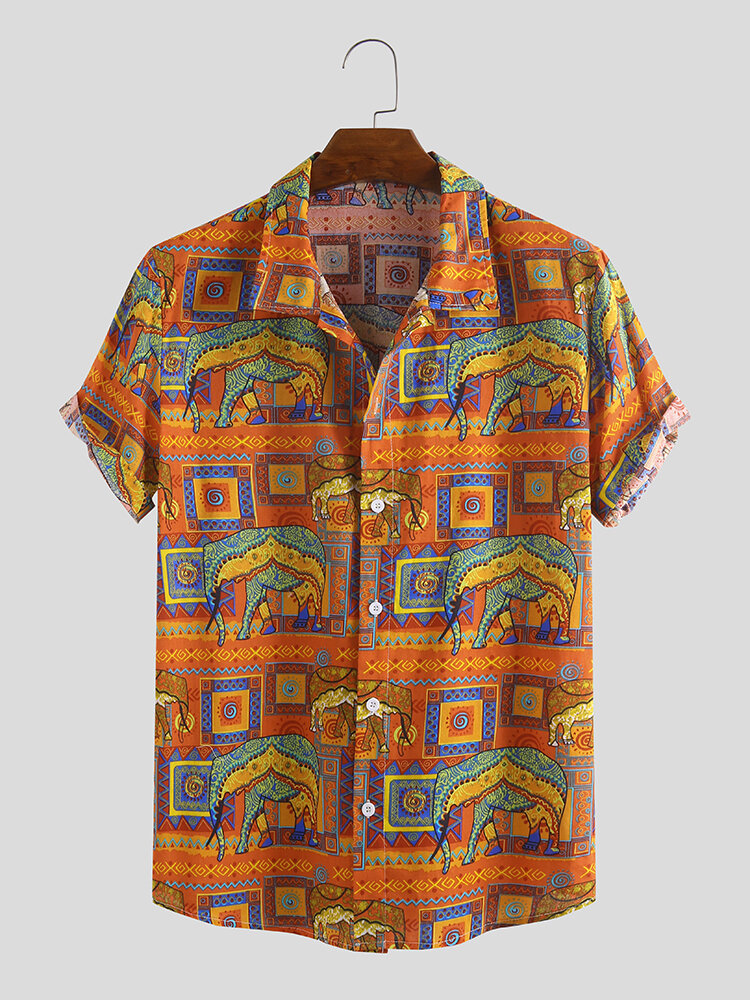 Men Animal Ethnic Pattern Print Short Sleeve Shirts – XL Orange
