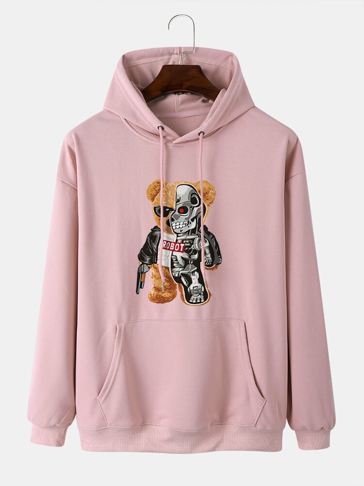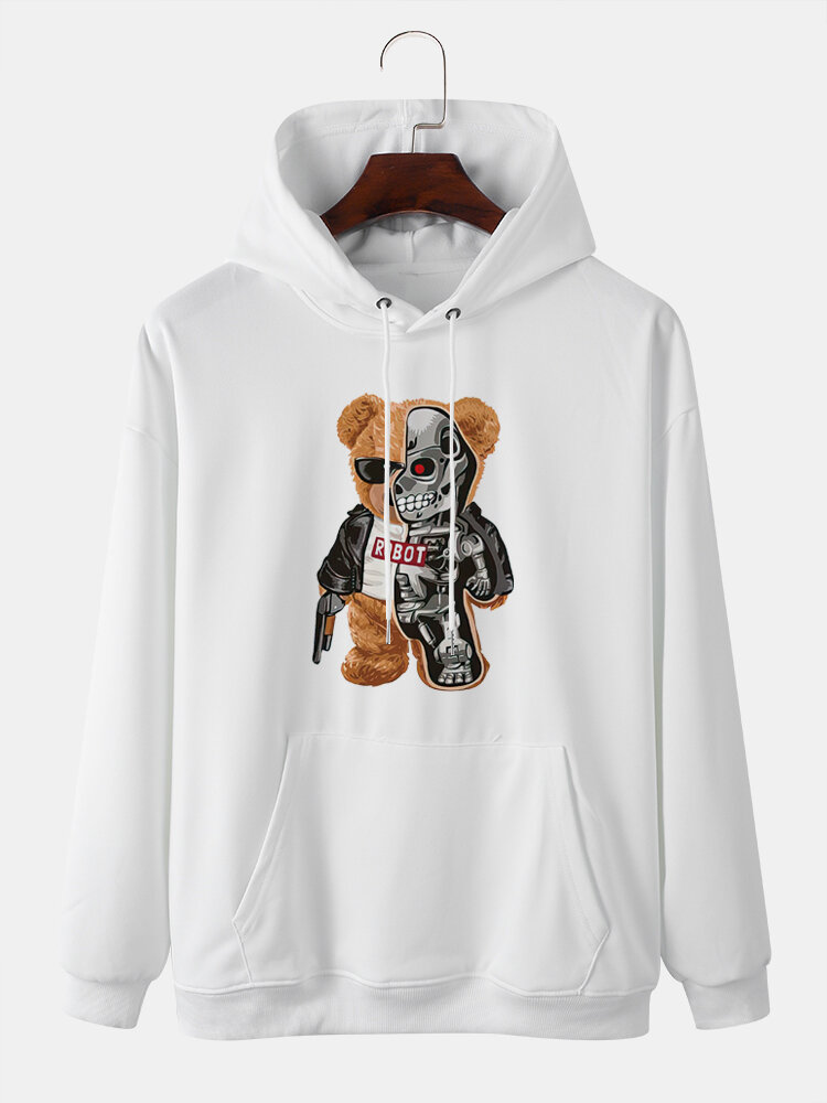 Men Bear Pattern Kangaroo Pocket Long Sleeve Hooded Sweatshirt – White S