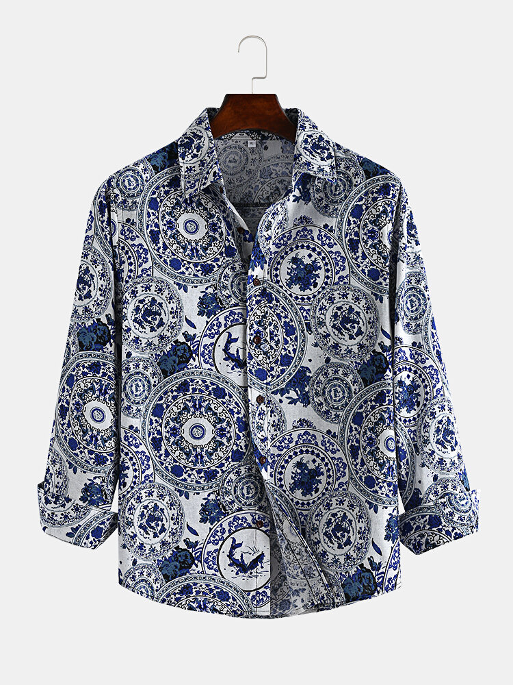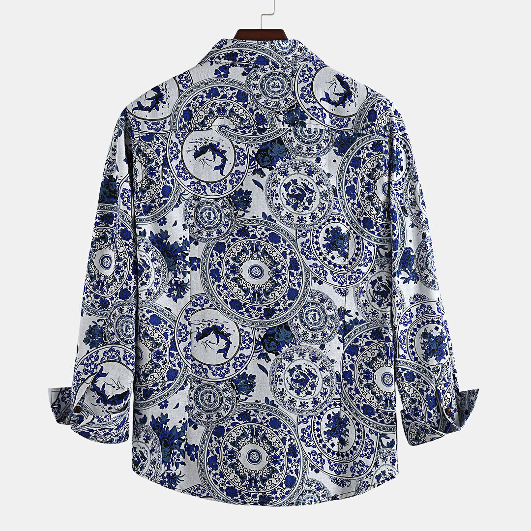 Men Blue and White Porcelain Print Long Sleeve Shirts – S Blue