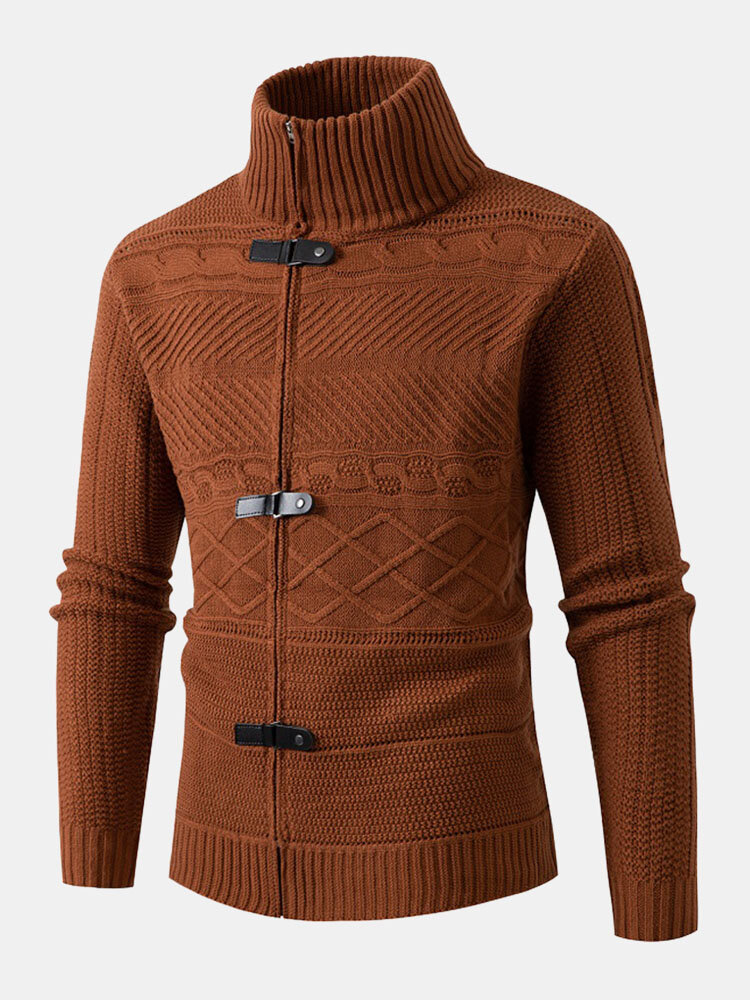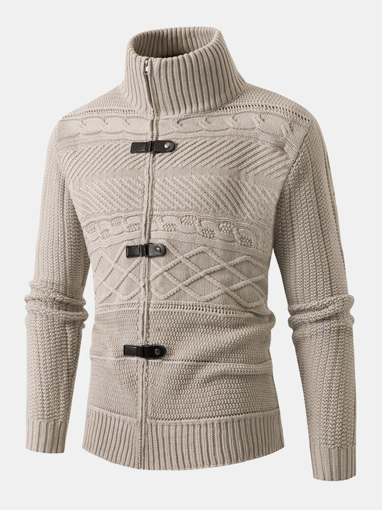 Men Cable Knitted Textured Buckle High Neck Solid Front Zipper Outdoor Sweaters – Khaki M