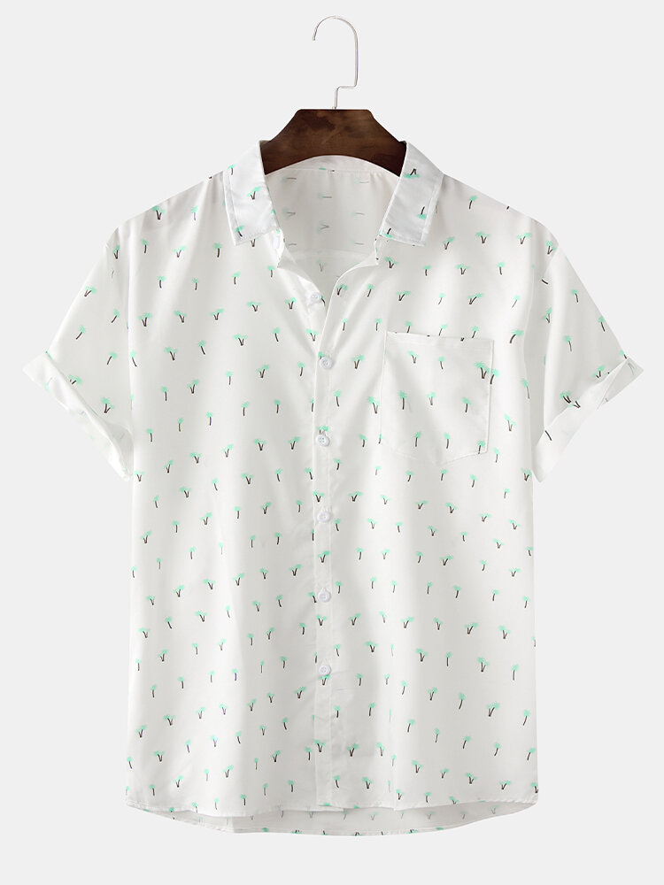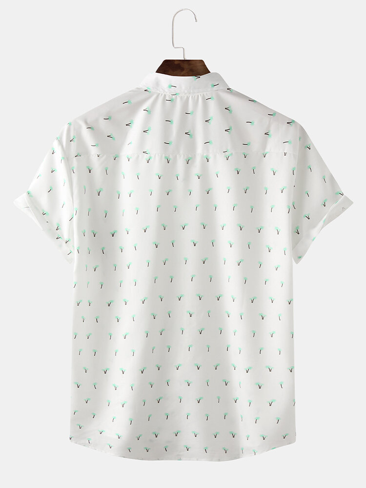 Men Casual Cotton Graffiti Little Tree Print Turn Down Collar Short Sleeve Shirts – White 2XL