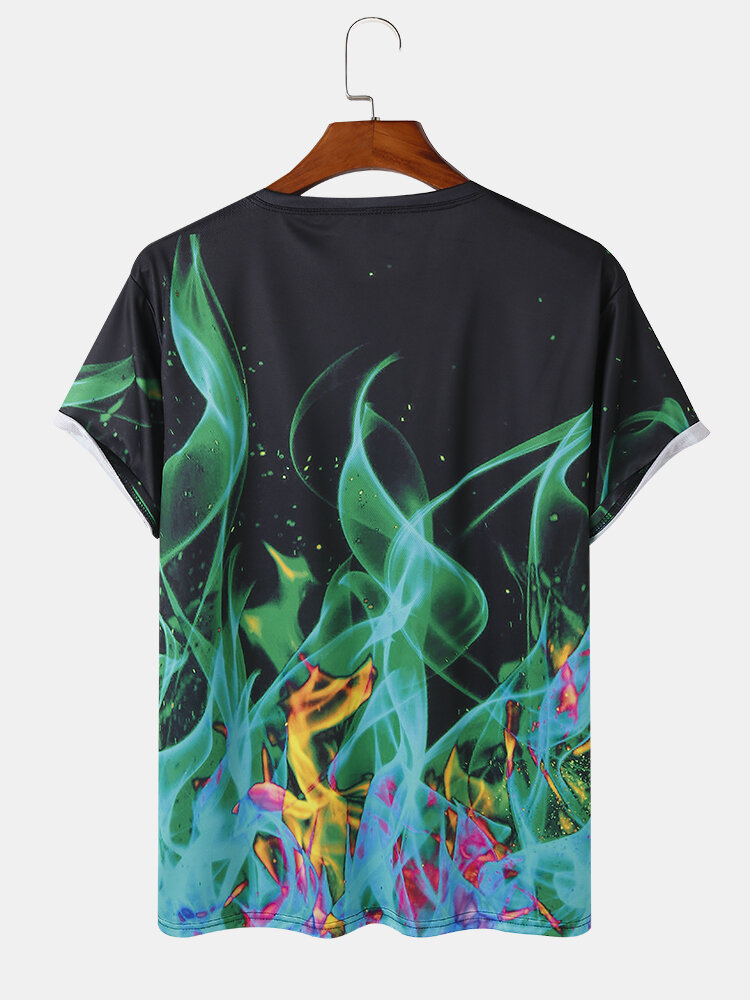 Men Casual Fire Pattern Round Neck Short Sleeve T-Shirts – Black L