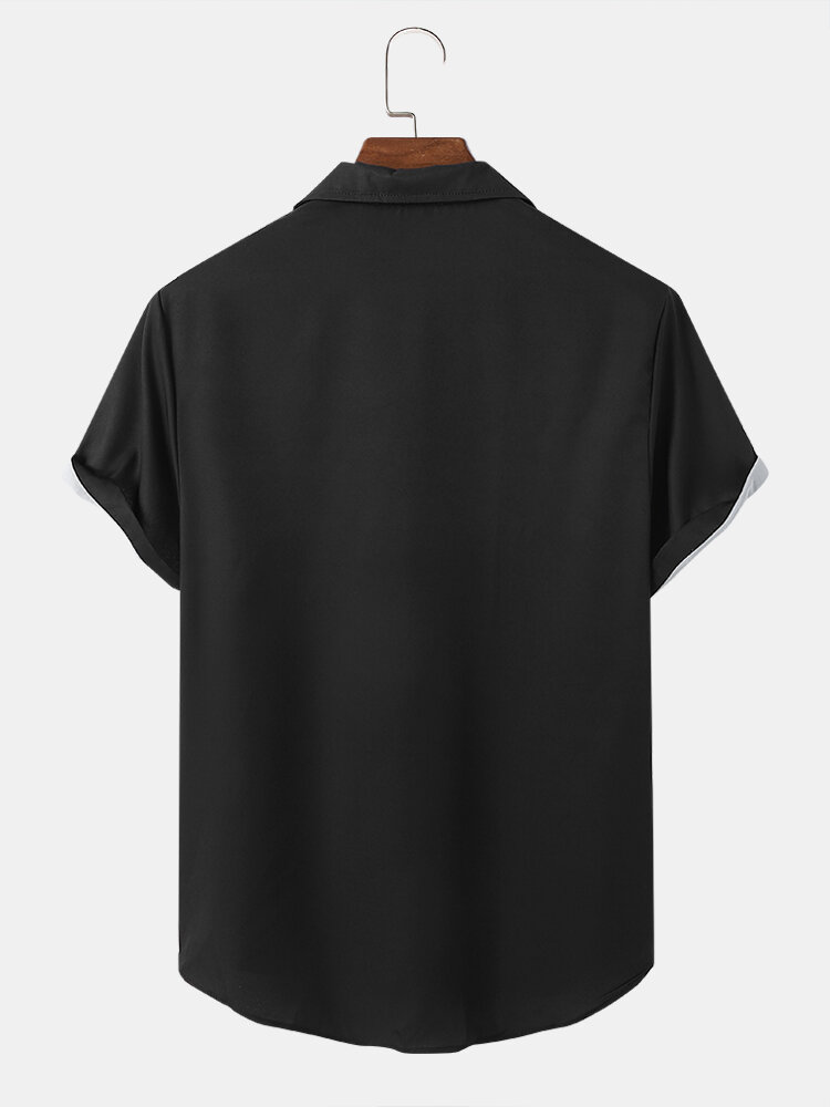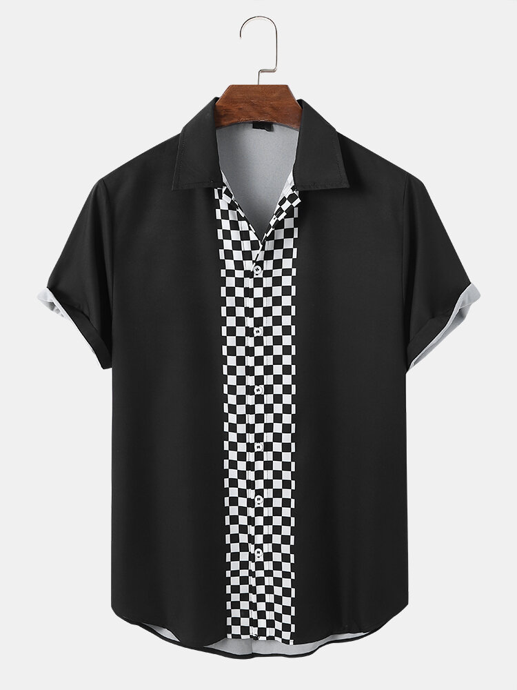 Men Checkerboard Patchwork Color Block Front Buttons Casual Shirts – Black XL
