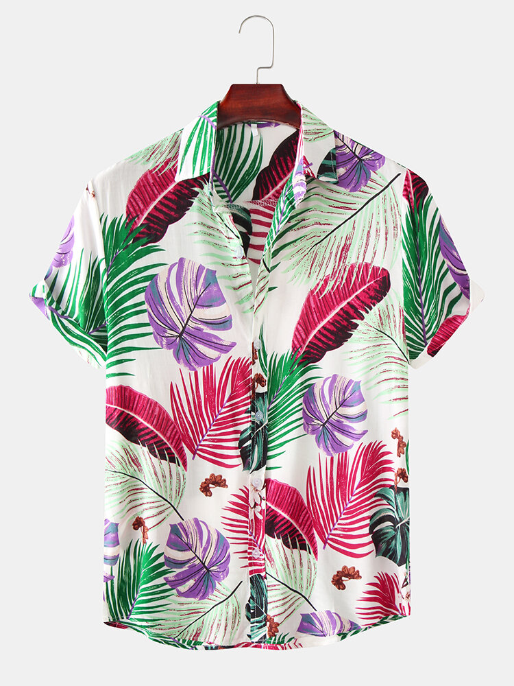 Men Color Block Leaves Print Turn Down Collar Hawaii Beach Short Sleeve Shirts – White S