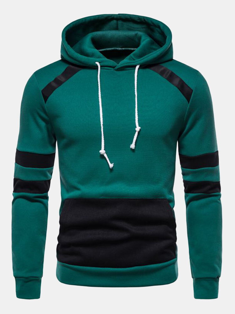 Men Color Block Strip Patch Kangaroo Pocket Drawstring Casual Hooded Sweatshirt – Khaki M