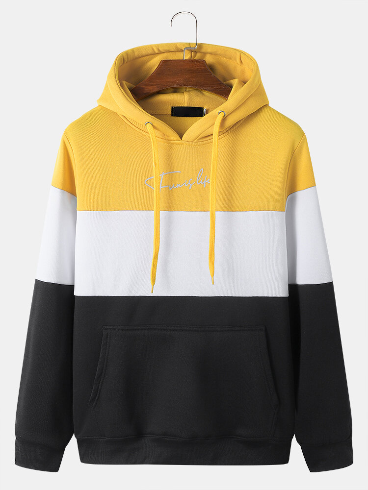 Men Color Block Strip Patchwork Kangaroo Pocket Letter Drawstring Hooded Sweatshirt – Yellow M