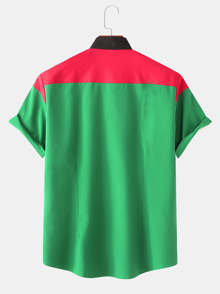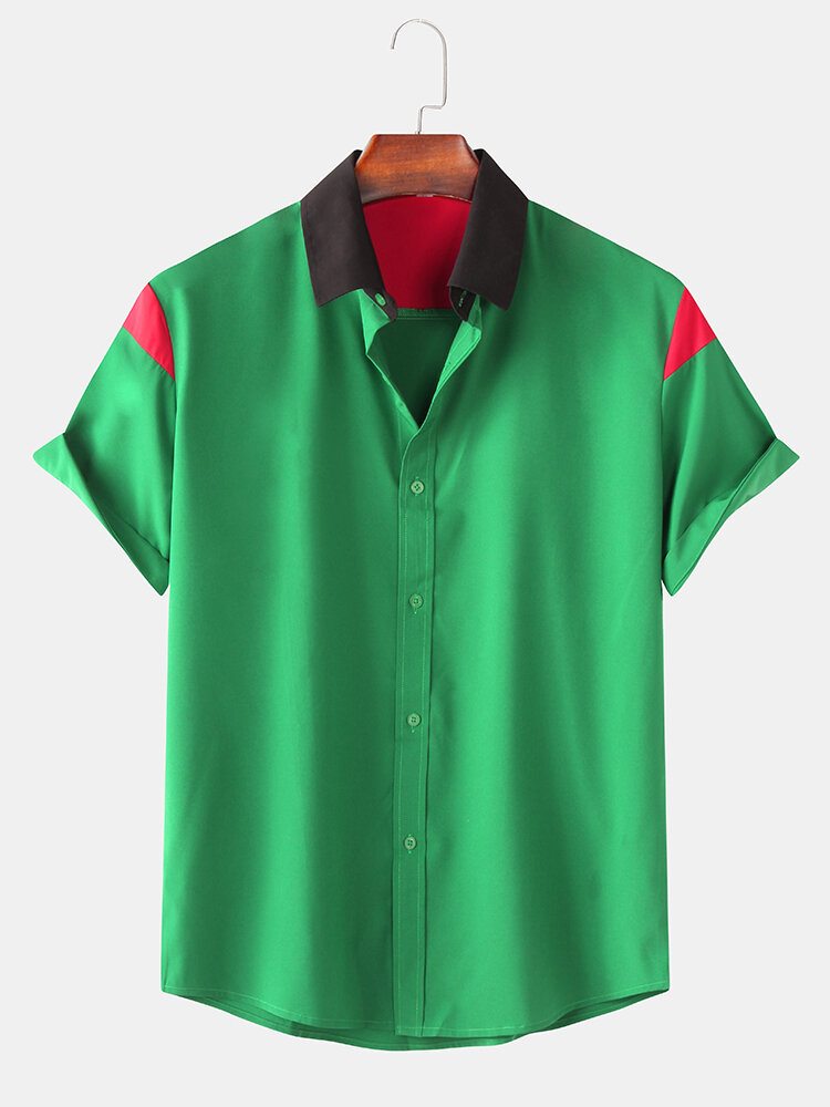 Men Color Block Turn Down Collar Short Sleeve Casual Shirts – Green M