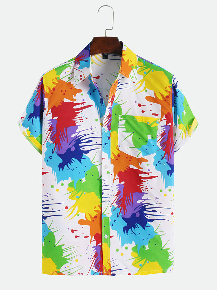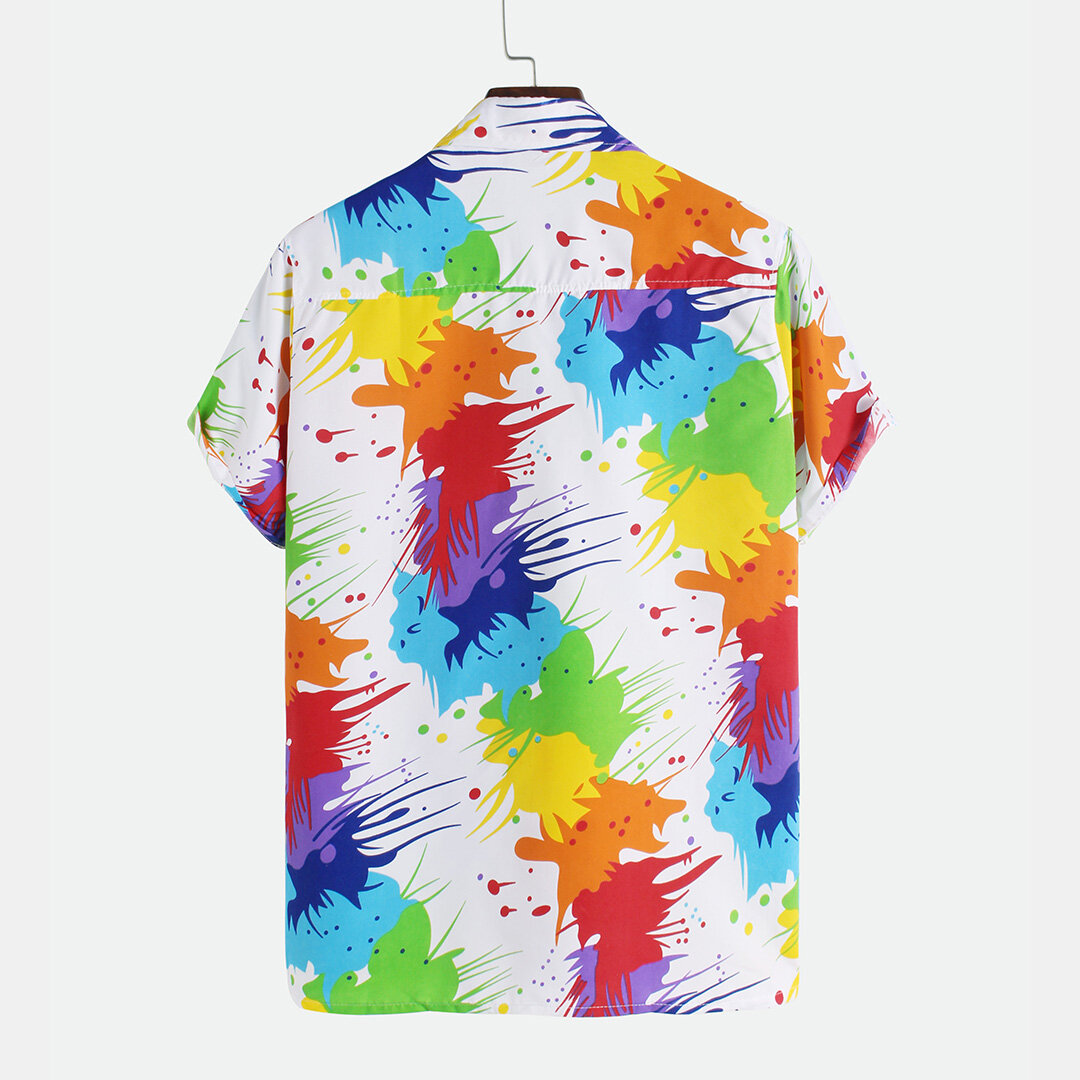Men Colorful Inkjet Print Short Sleeve Shirts – S White