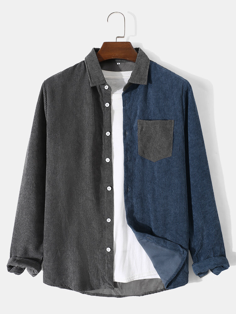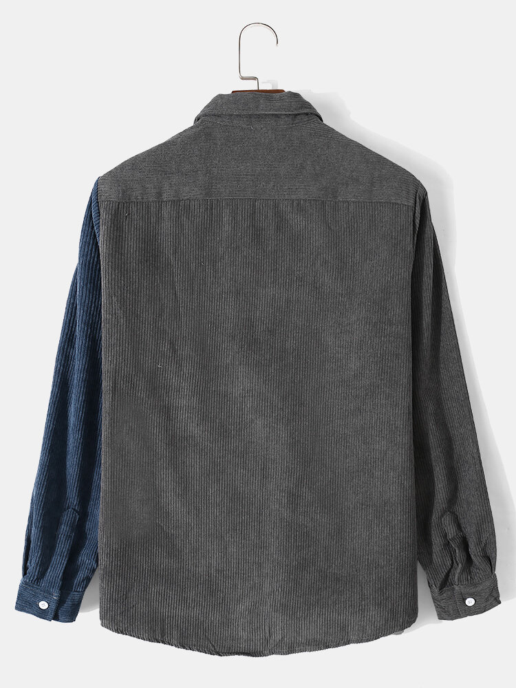 Men Corduroy Contrast Colorblock Front Button Lapel Casual Shirts – Grey XL
